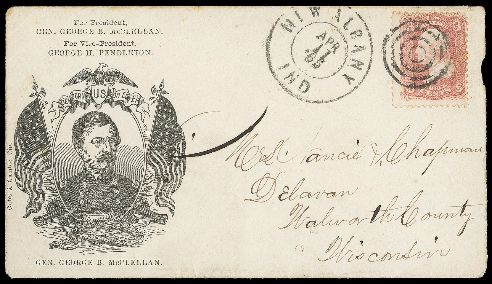 190     GM-3 image(1864 Campaign) George B. McClellan, George H. Pendleton. Patriotic campaign design with portrait surrounded by flag, eagle and cannons, above "For President General George B. McClellan, For Vice President George H. Pendelton" imprint and below "Gen. George B. McClellan" caption on cover bearing 3¢ rose (65) tied by target cancel duplexed with "New Albany Ind. Apr 11, 1865" cds to Delval Wisc.; small right edge nick, Very Fine and beautiful patriotic campaign design, used only four days before Lincoln assassination.