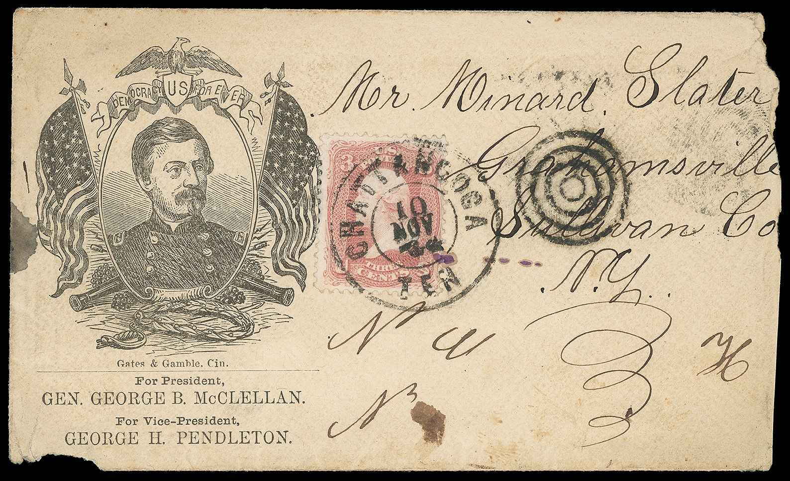 191     GM-4 image(1864 Campaign) George B. McClellan. Patriotic campaign design with portrait surrounded by flag, eagle and cannons, below with "Gen. George B. McClellan" caption and "For President General George B. McClellan, For Vice President George H. Pendelton" imprint on cover bearing 3¢ rose (65) tied by "Chattanooga, Ten. 10 Nov '64" target duplex to Grahamsville N.Y.; reduced at right and bottom left nick, couple ink stains, Fine and rare design, the only recorded example.