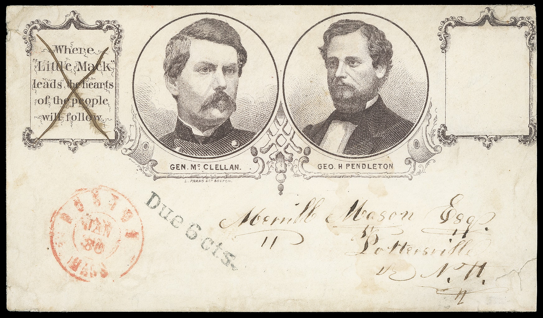 192     GM-5 image(1864 Campaign) George B. McClellan, George H. Pendleton. Campaign design with dual oval portraits in ornamental frames with additional boxed frames, one with slogan "Where Little Mack Leads the Hearts of the People will Follow" ms. crossed out and second is stamp collar, on cover with red "Boston, Mass. Jan 30" cds and "Due 6cts." straightline for 3¢ letter rate plus 3¢ penalty; reduced at right with bottom corner tear, Very Fine appearance, only two recorded used examples, ex-Meroni, Bischel.