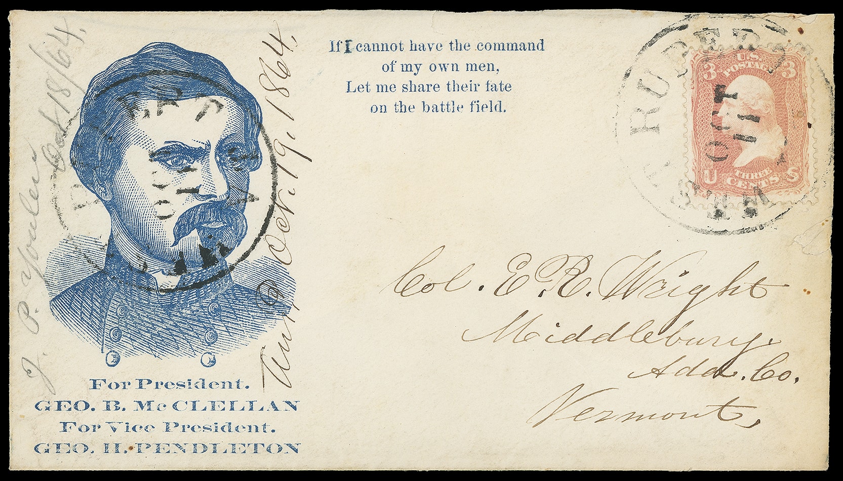 195     GM-unlisted image(1864 Campaign) George B. McClellan, George H. Pendleton. Blue large portrait campaign design with "For President Geo. B. McClellan, For Vice President Geo H. Pendelton" imprint below and additional verse to right on cover bearing 3¢ rose (65) tied by "West Rupert Vt. Oct 11" cds to Middlebury Vt.; neat vertical docketing to left and right of design, trivial small tear at right center, Very Fine and attractive, unlisted in Milgram Presidential Campaigns book, only recorded used example, with 2006 P.F. certificate.