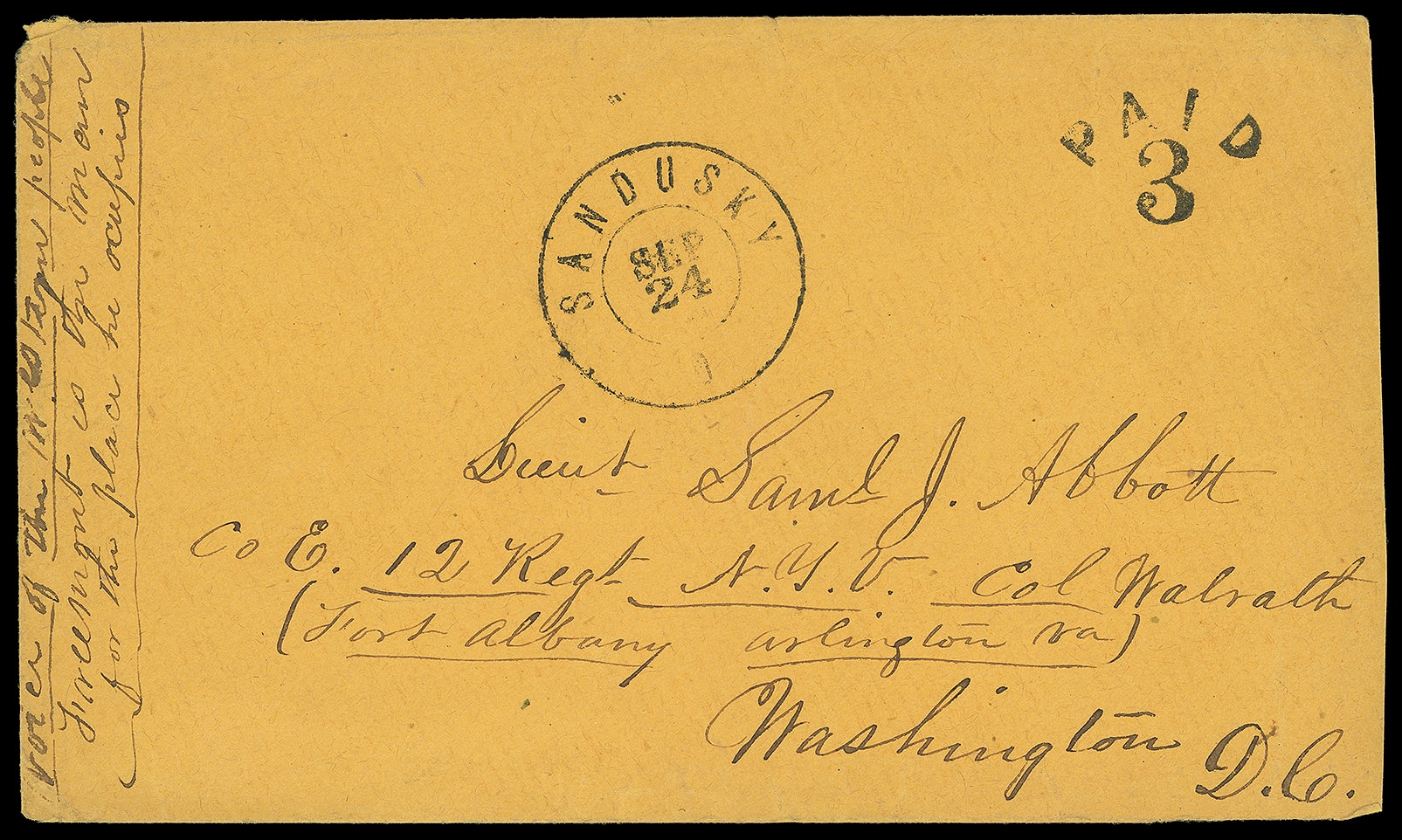 199       image(1864 Campaign) John Fremont. Unofficial campaign cover with vertical manuscript "Voice of the Western people, Freemont is the man for this place he occupies" at left on orange cover with "Sandusky O. Sep 24" cds with matching bold arc "Paid 3" and "Sandusky, O. Sep 24" dcds with military address to Lieut. Samuel J. Abbott, Co. E. 12th Regt. N.Y.V. Col Walrath (Fort Albany, Arlington Va.) Washington, DC, additional manuscript on reverse "Come away with honor, Keep to your Post"; reduced at right, Very Fine.