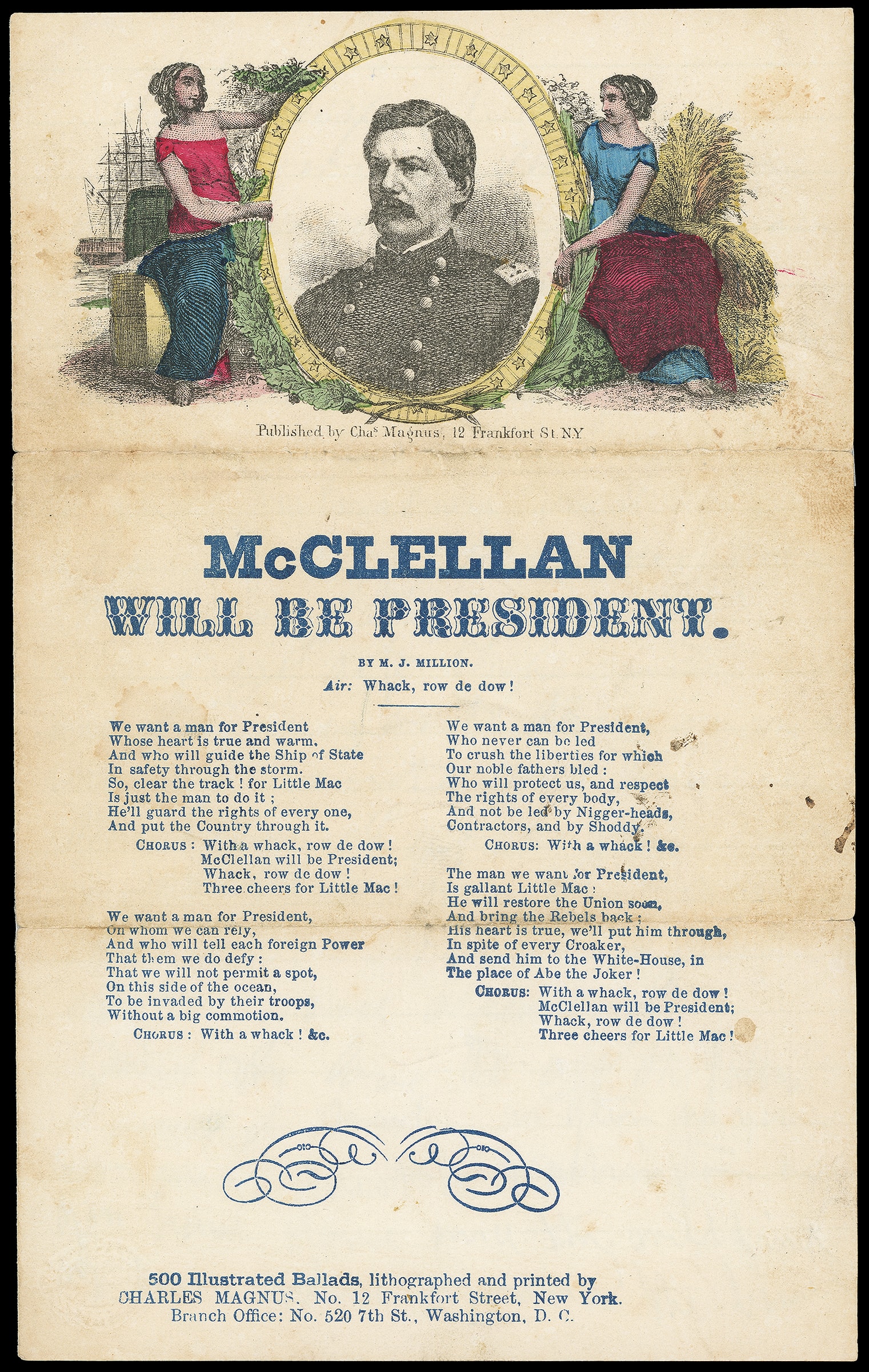194     GM-12 image(1864 Campaign) George B. McClellan. Multicolor Magnus "McClellan Will Be President" patriotic campaign design on song sheet with black portrait, patriotic verses; light toning and fold wear, Very Fine and scarce.