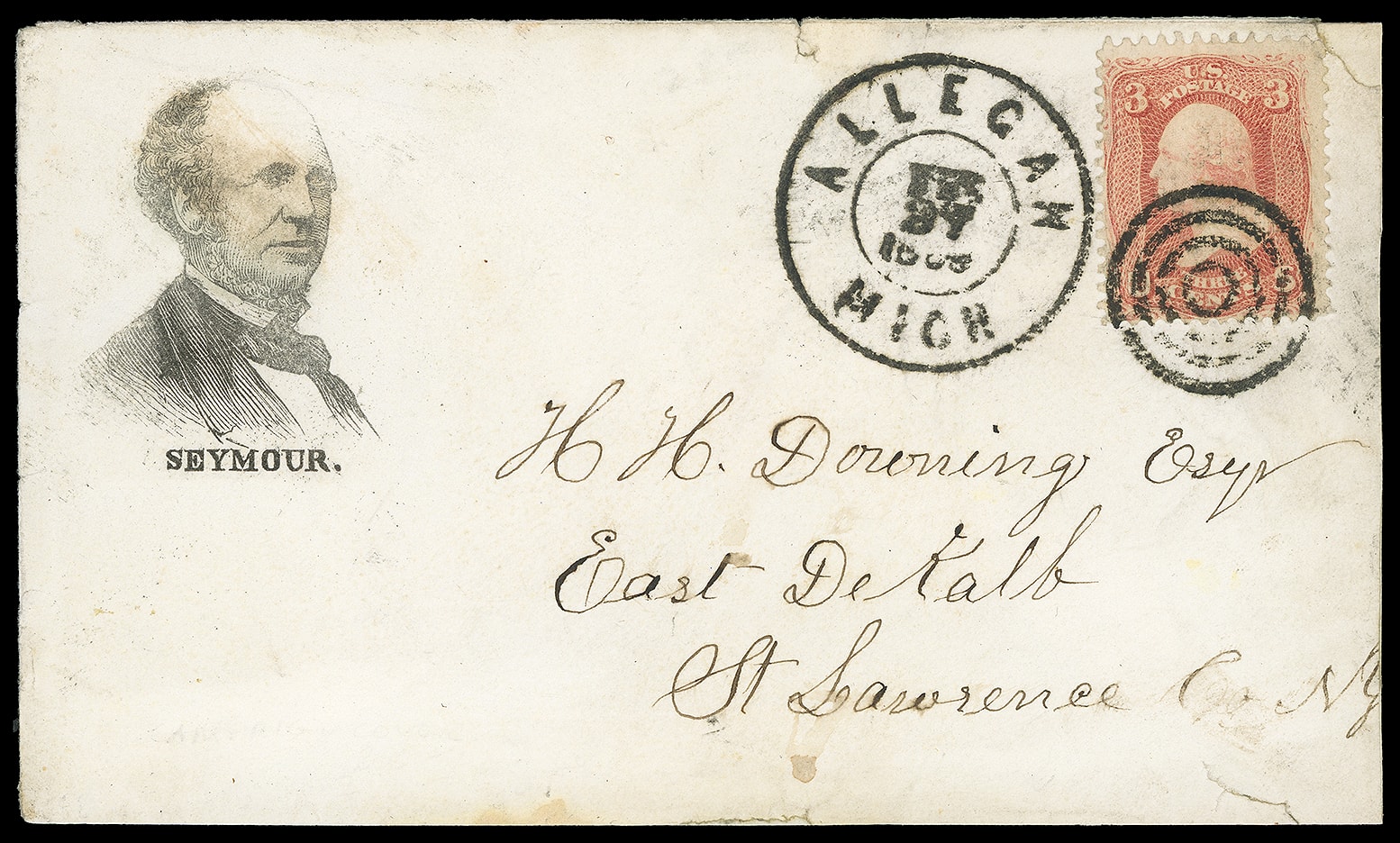200     HS-1 image(1868 Campaign) Horatio Seymour. Large portrait campaign design with "Seymour" caption below on cover bearing 3¢ red, grill (94) tied by bold target cancel duplexed "Allegan, Mich. Feb 27, 1869" cds to East DeCalb N.Y.; small flaws, F.-V.F., ex-Walcott.
