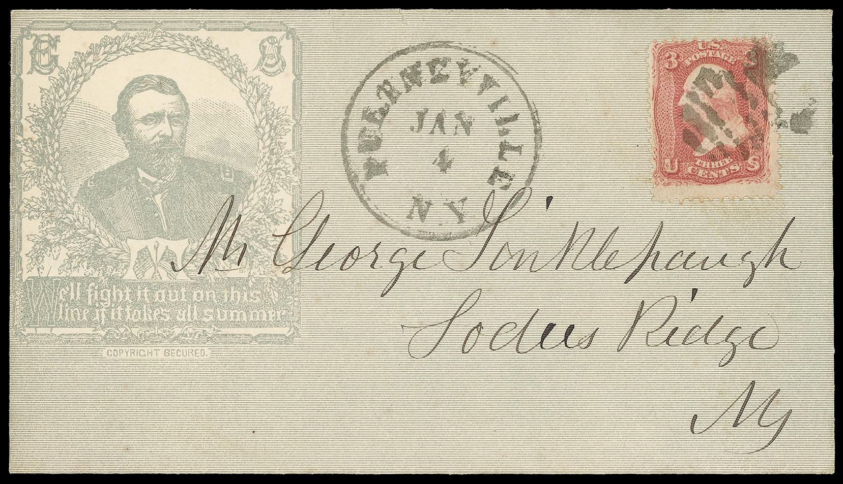 218     UG-19 image(1868 Campaign) Ulysses S. Grant. Overall gray campaign design with portrait in oval wreath encased in ornate box with verse below "We'll fight it out on this line if it takes all summer" on cover bearing 3¢ red, grill (94) tied by cork cancel, matching "Pultneyville N.Y. Jan 4" cds to Lodus Ridge N.Y.; top edge and backflap opening tears, Very Fine and attractive.