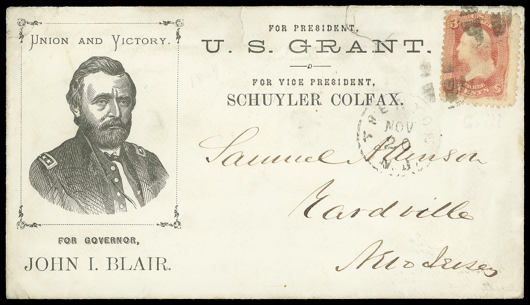 214     UG-9 image(1868 Campaign) Ulysses S. Grant - Schuyler Colfax. Portrait campaign design in fancy rectangle campaign design with "Union and Victory" verse above, additional "For President U.S. Grant, For Vice President Schuyler Colfax" at right, additional "For Governor John L. Blair" below on cover bearing 3¢ rose, grill (94) tied by segmented cork cancel, matching indistinct "Trenton, N.J. Nov 20" cds to Yardville N.J.; two top edge tears, otherwise Very Fine and scarce design.