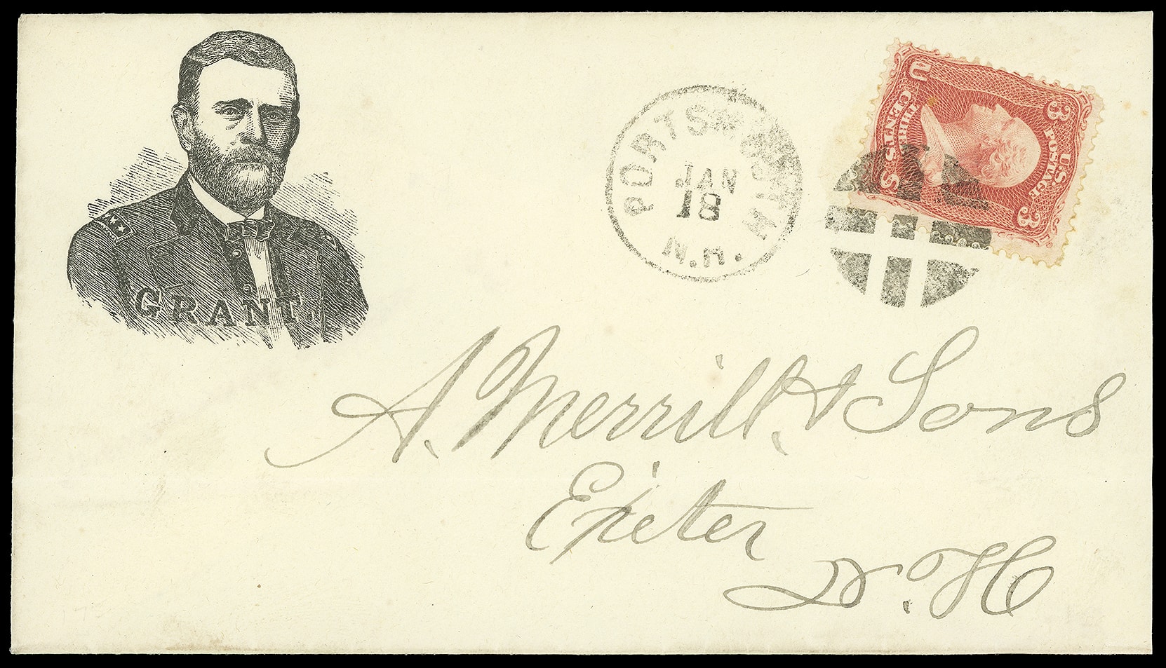 216     UG-11 image(1868 Campaign) Ulysses S. Grant. Portrait in uniform campaign design on fresh amber cover bearing 3¢ red, grill (94) tied by fancy segmented cork cancel duplexed with "Portsmouth, N.H. Jan 18" cds to Exeter N.H.; light horizontal bend through address panel, Extremely Fine and exceptionally attractive.