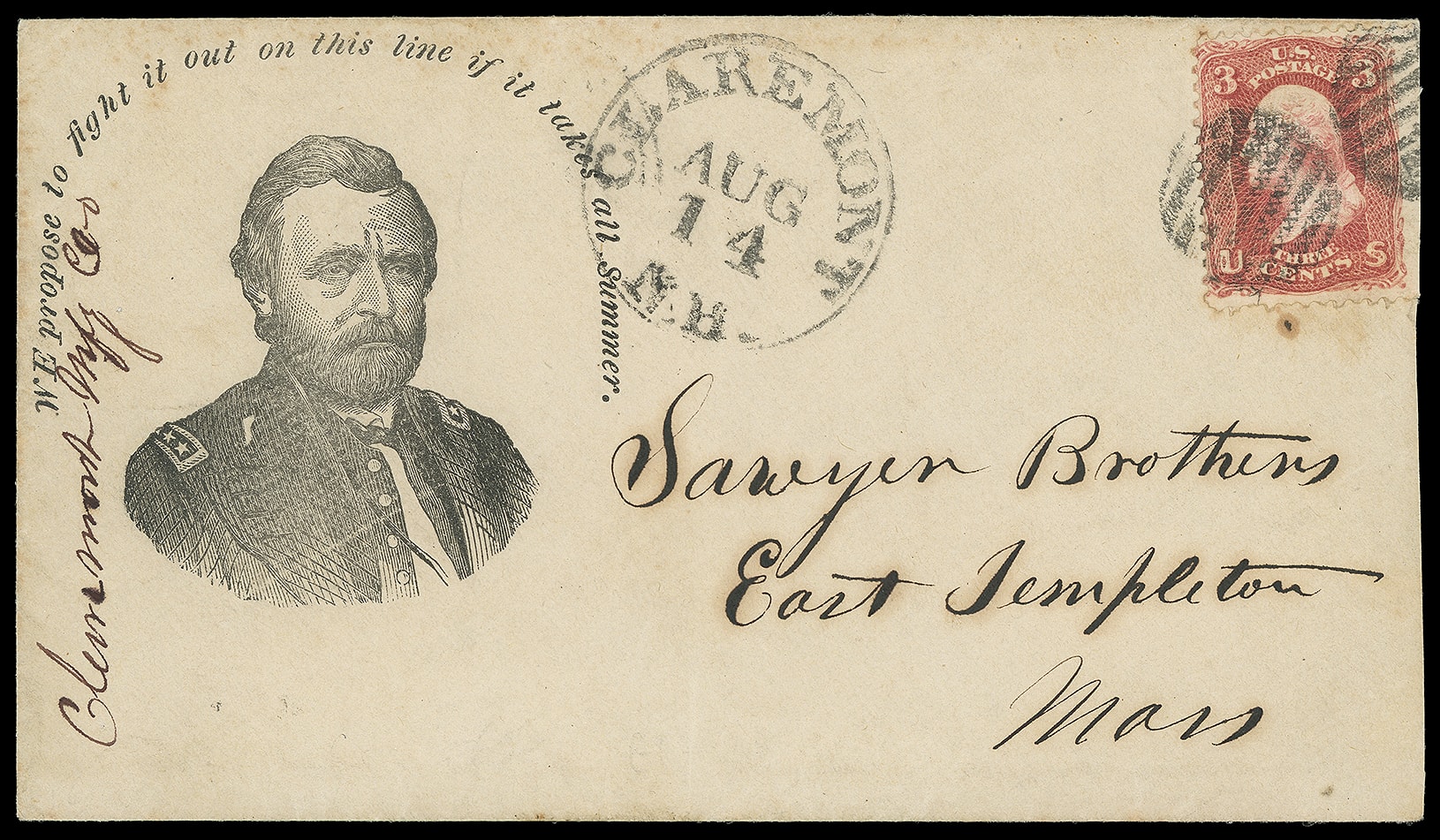 210     UG-3 image(1868 Campaign) Ulysses S. Grant. Portrait in uniform fcampaign design with circular verse above "We fight it out on this line if it takes all summer" on cover bearing 3¢ red, grill (94) s.e. at right, tied by circular grid cancels, matching "Claremont, Mass. Aug 14" cds to East Templeton, Mass.; barely reduced at right just affecting 3¢, Very Fine, ex-Walcott.