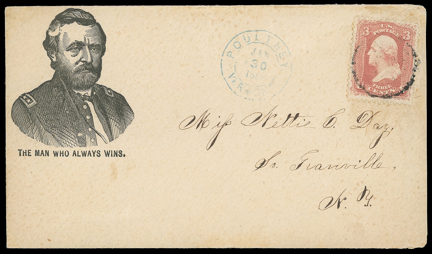 212     UG-4A image(1868 Campaign) Ulysses S. Grant "The Man Who Always Wins". Portrait campaign design with verse below on cover bearing 3¢ rose (65) tied by circular cancel, blue "Poultney, Vermont, Jan 30 1869" cds to So. Farmsville N.Y., with original letter; reduced slightly at right, Very Fine and scarce design.