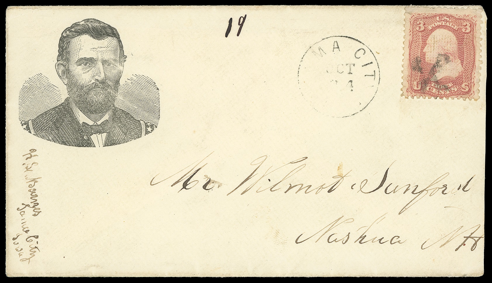 215     UG-10 image(1868 Campaign) Ulysses S. Grant. Portrait in uniform campaign design on amber cover bearing 3¢ red (94) canceled by radial duplexed with partial "Tama City, Iowa, Oct 24" cds to Nashua N.H.; reduced slightly at right, 3¢ couple tiny tears, Very Fine.