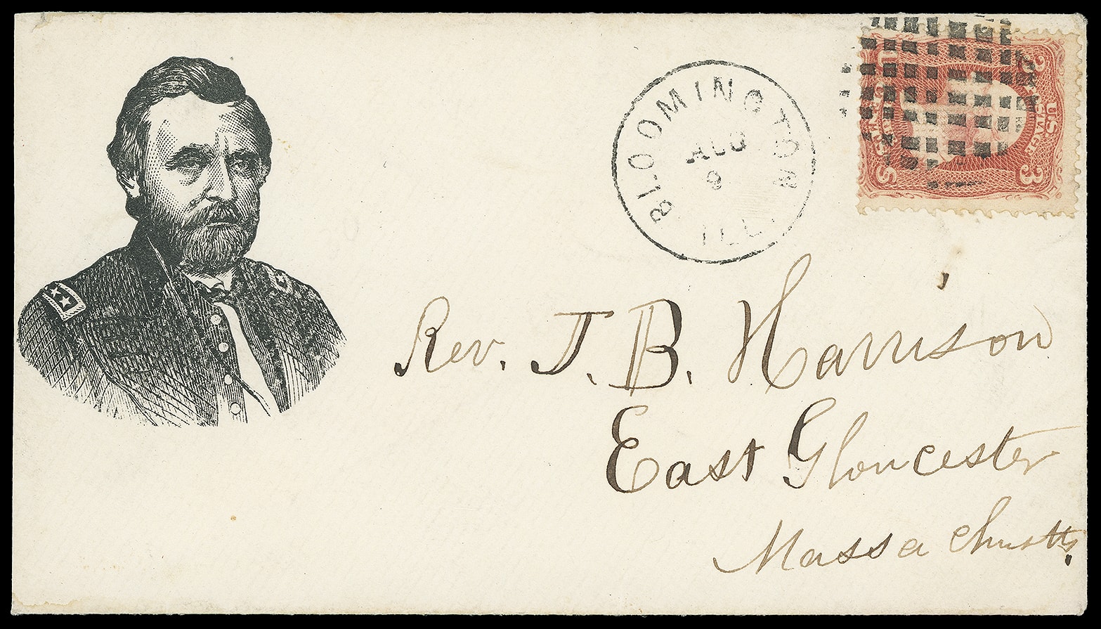 209     UG-1 image(1868 Campaign) Ulysses S. Grant. Uniform portrait campaign design on cover bearing 3¢ red, grill (94) tied by fancy circle of small squares duplexed with "Bloomington Ill. Aug 9" cds to East Gloucester Mass.; reduced slightly at left, Extremely Fine and choice.