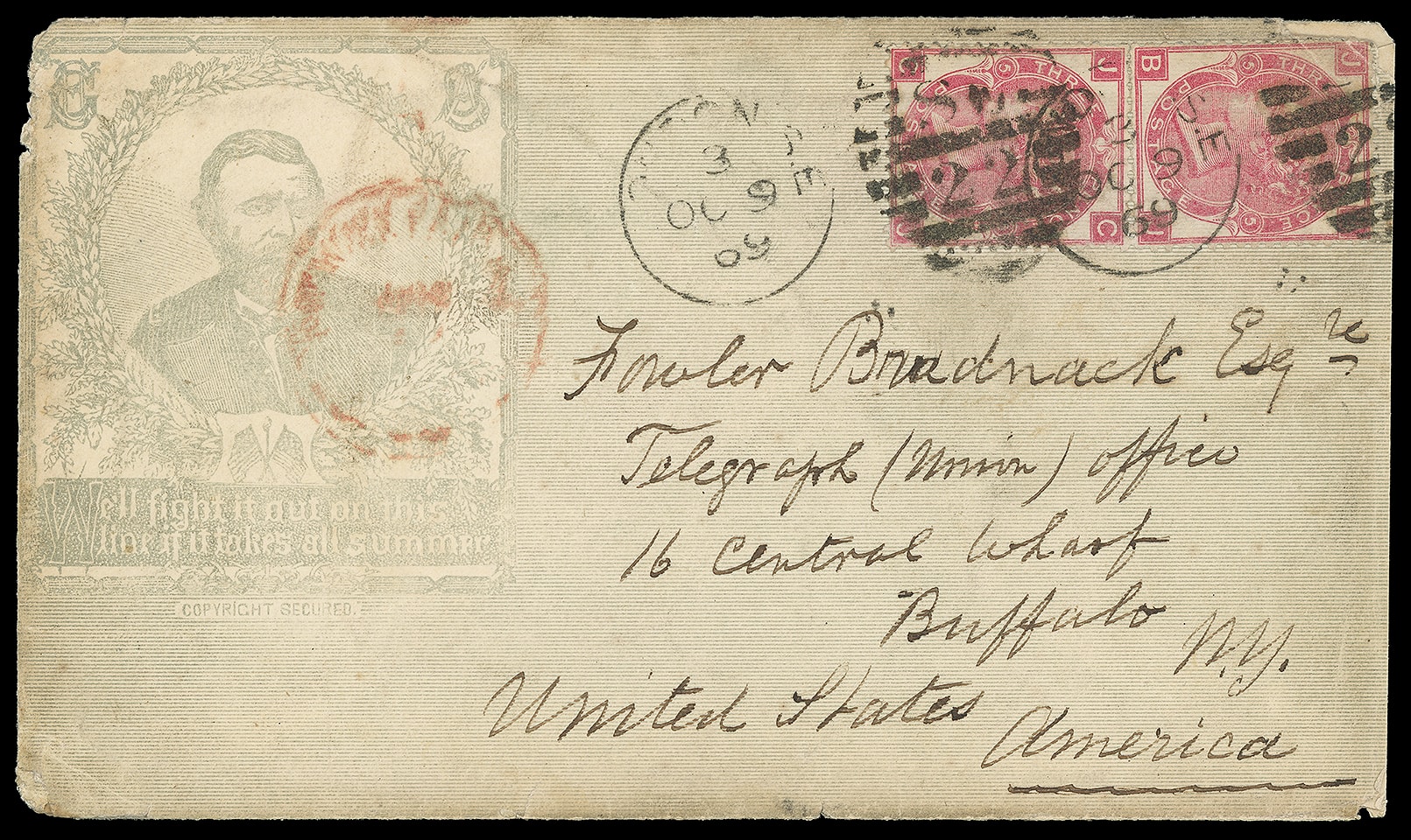 219     UG-19 image(1868 Campaign) Ulysses S. Grant. Overall gray campaign design featuring portrait in ornamental frame with verse, on cover bearing G.B. 3d rose (49, plate 5) vertical pair tied by two strikes of "London S.E., OC 9, 69" duplex with "SE/22" barred oval to Buffalo N.Y., red "New York, Paid All, Oct 22" exchange cds; light soiling and edge wear, reduced slightly at right, right stamp creases, F.-V.F. and extremely scarce foreign use.