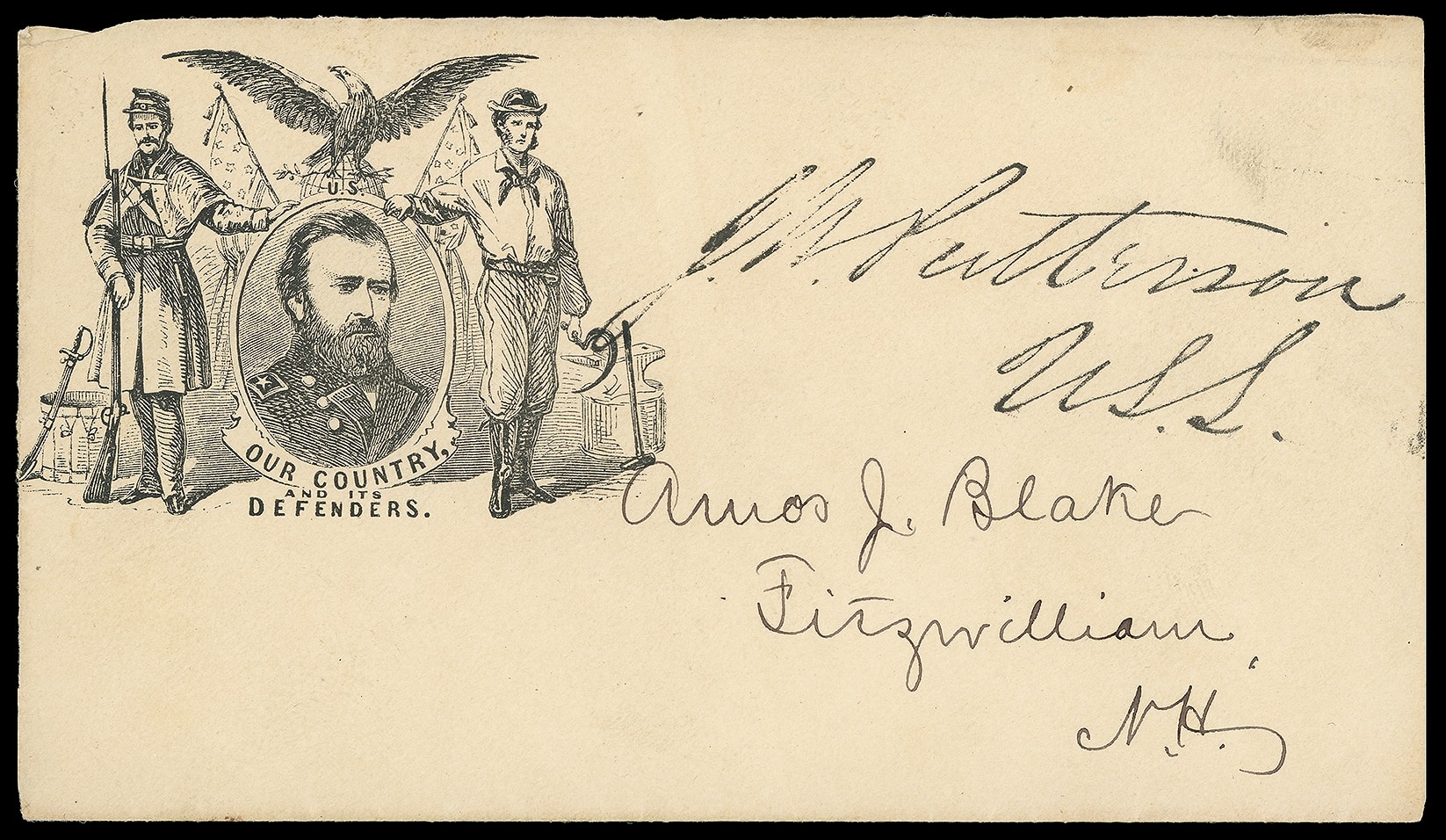 220     UG-20 image(1868 Campaign) Ulysses S. Grant "Our Country and its Defenders". Campaign design with oval portrait in ornate patriotic frame and verse below featuring eagle, flags and soldier on amber cover with "James Patterson U.S.S" Senator free frank to Fitzwilliam N.H.; open on three sides, flap missing, fresh and Very Fine.