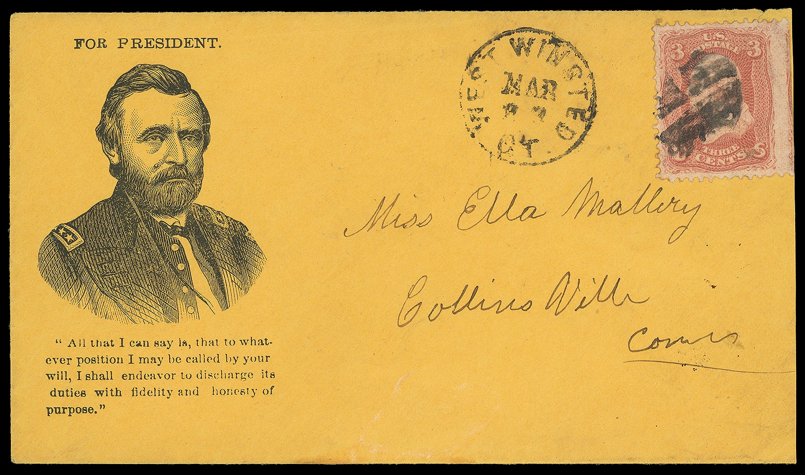 213     UG-7 image(1868 Campaign) Ulysses S. Grant "For President". Uniform portrait campaign design with additional quotation below on orange cover bearing 3¢ rose (65) barely tied by segmented cork cancel duplexed with "West Winsted Ct. Mar 12" cds to Collinsville Conn.; barely reduced at right still, fresh and Extremely Fine, ex-Jarrett.