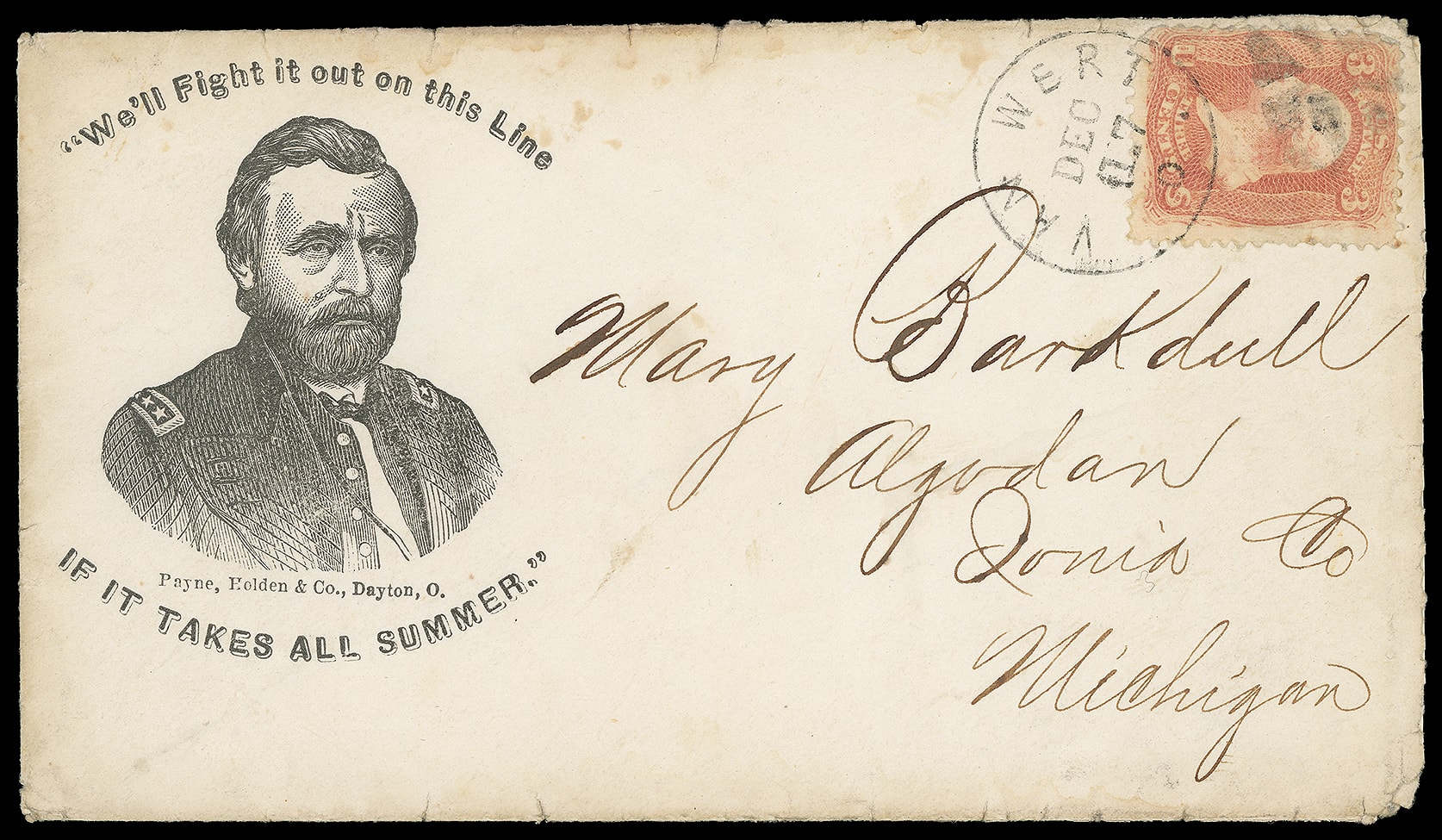 211     UG-3 Var image(1868 Campaign) Ulysses S. Grant "We'll Fight it out on this Line If It Takes All Summer". Uniform portrait campaign design with verse above and below, "Payne, Holden & Co." imprint on cover bearing 3¢ red, grill (94) tied by "Van Wert, O. Dec 17" cds to Algodan Mich.; small edge flaws, F.-V.F., only recorded example.