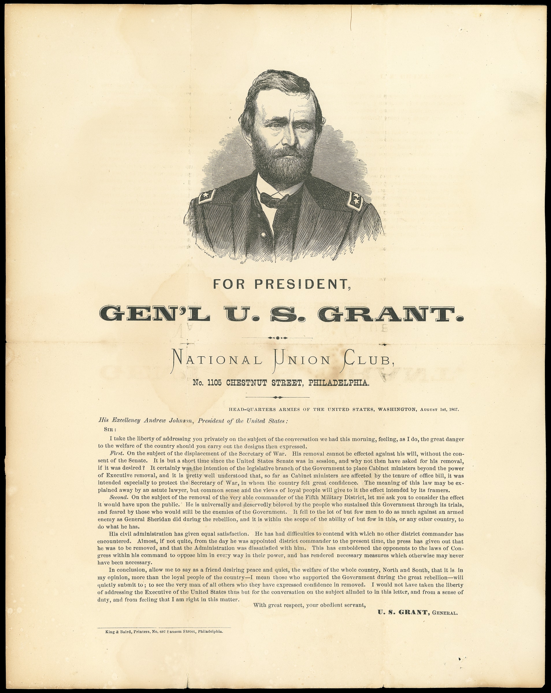 217     UG-16 image(1868 Campaign) Ulysses S. Grant "For President Gen'l U.S. Grant". Engraved portrait in uniform on large-size Campaign broadside for "National Union Club, Philadelphia" with printed August 1st 1867 letter written to President Andrew Johnson from Candidate General U.S. Grant; typical filefolds, Very Fine and scarce 1868 campaign broadside.