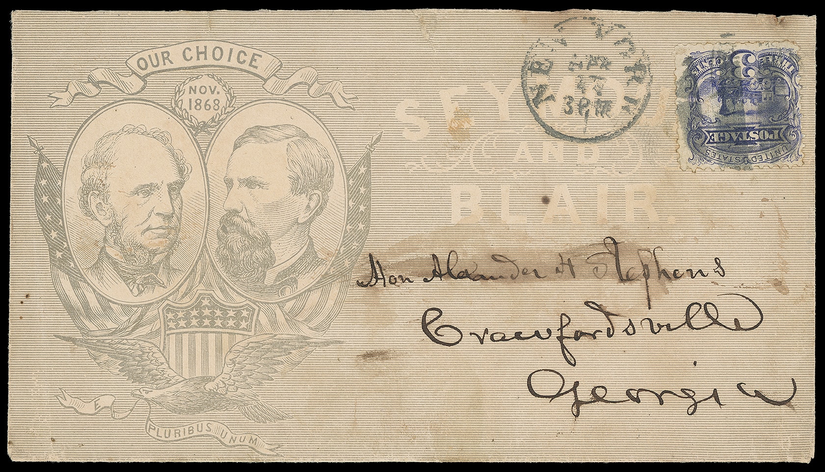 205     HS-7 image(1868 Campaign) Horatio Seymour, Francis P. Blair. Overall gray campaign design with dual oval portraits in patriotic frame showing flags and shield, banner above "Our Choice Nov. 1868" and additional negative "Seymour and Blair" at right on cover bearing 3¢ ultramarine (114) tied by three-bar grid duplexed with "New York, Apr 17" cds addressed to Hon. Alexander Stephens at Crawfordville Ga.; top edge tear and flap torn, addressee lightly crossed out, F.-V.F.