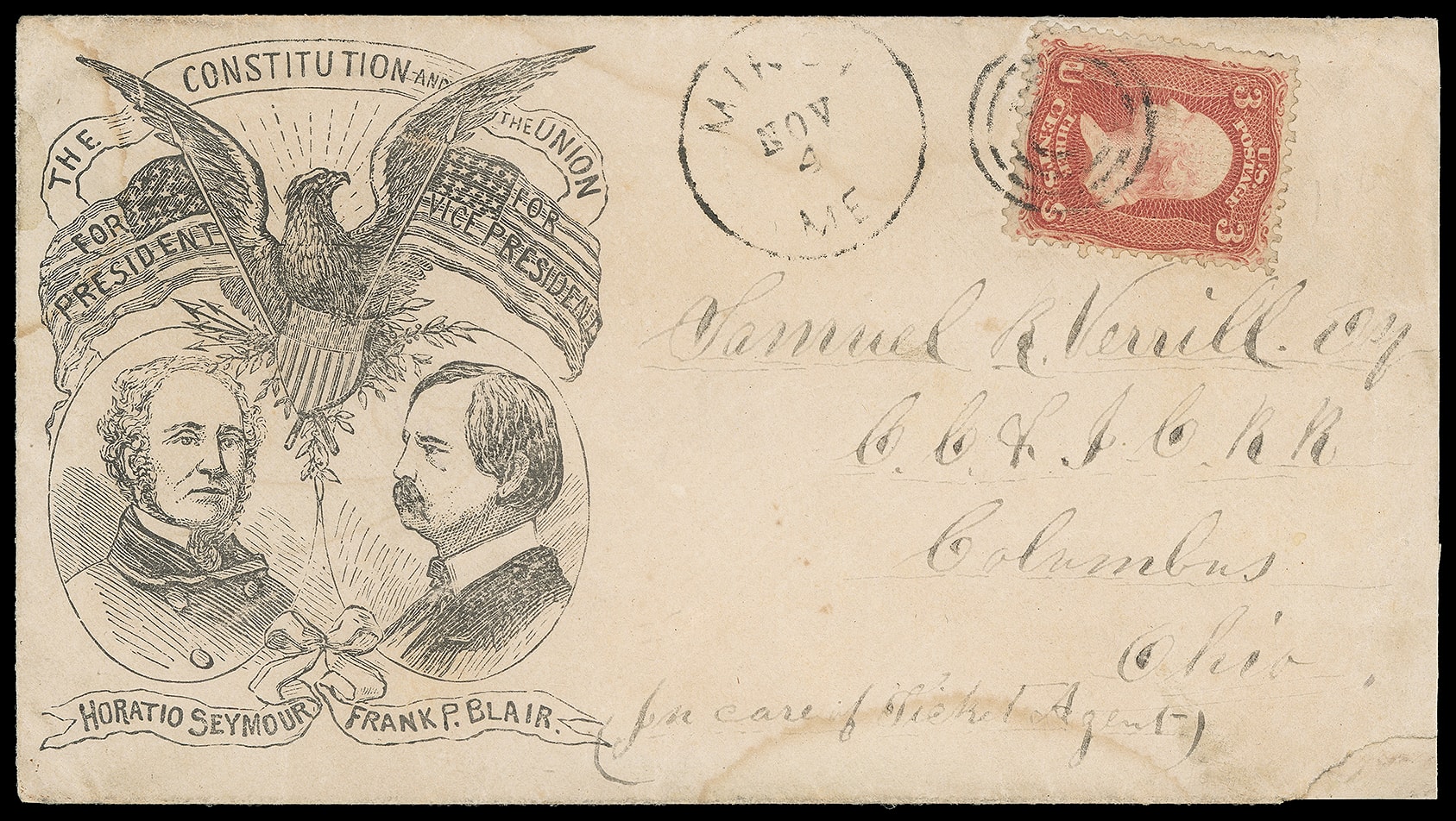 204     HS-6 image(1868 Campaign) Horatio Seymour, Francis P. Blair. Campaign design with dual oval portraits in patriotic frame showing large eagle and flags, "The Constitution and the Union" ribbon above and name captions in lower ribbon, on light buff cover bearing 3¢ red, grill (94) tied by target cancel, matching "Minot Me. Nov 4" cds to Columbus Ohio; light stain and small lower right corner mend, F.-V.F. and scarce design.