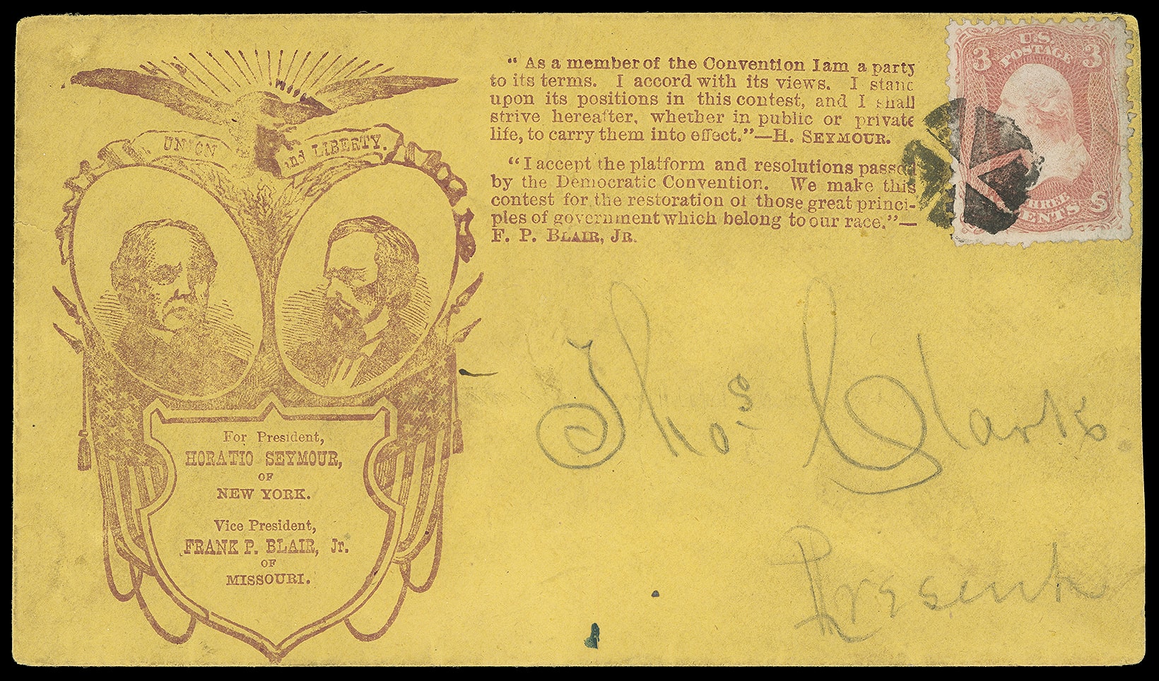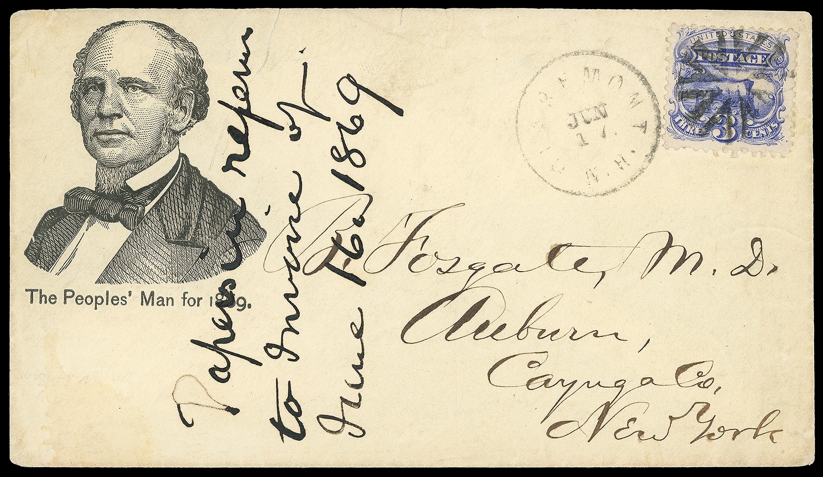 201     HS-2 image(1868 Campaign) Horatio Seymour. Large portrait campaign design with "The Peoples' Man for 1869" verse below on amber cover bearing 3¢ ultramarine (114) canceled by Circle of Vs fancy cancel, matching "Claremont N.H. Jun 17" cds to Auburn N.Y.; top left cover tear and erosion spot, vertical 1869 docketing; vertical manuscript docketing somewhat distracting still, Very Fine appearance, only recorded example.
