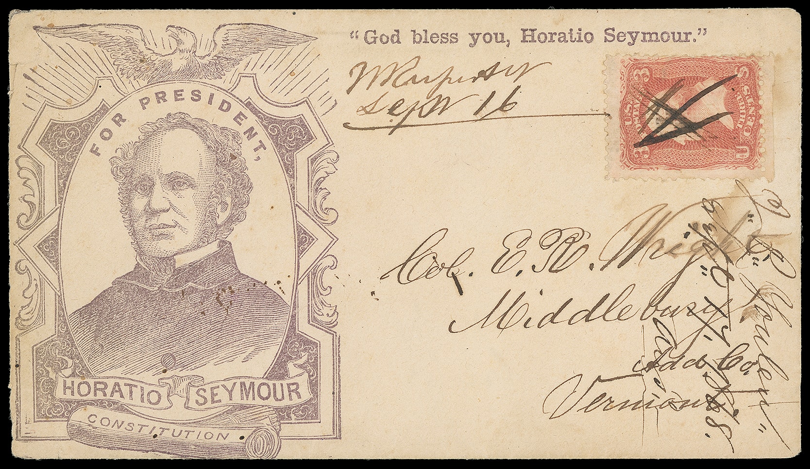207     HS-unlisted image(1868 Campaign) Horatio Seymour. Purple campaign design with oval portrait in ornate frame with eagle above and "For President", "Horatio Seymour" captions, additional verse "God bless you, Horatio Seymour" at right on cover bearing 3¢ red, grill (94) manuscript canceled and tied by ms. "W Rupert, Vt Sep 16" postmark to Middleburry, Vermont; vertical docketing at right, F.-V.F., unlisted in Milgram Presidential Campaigns.