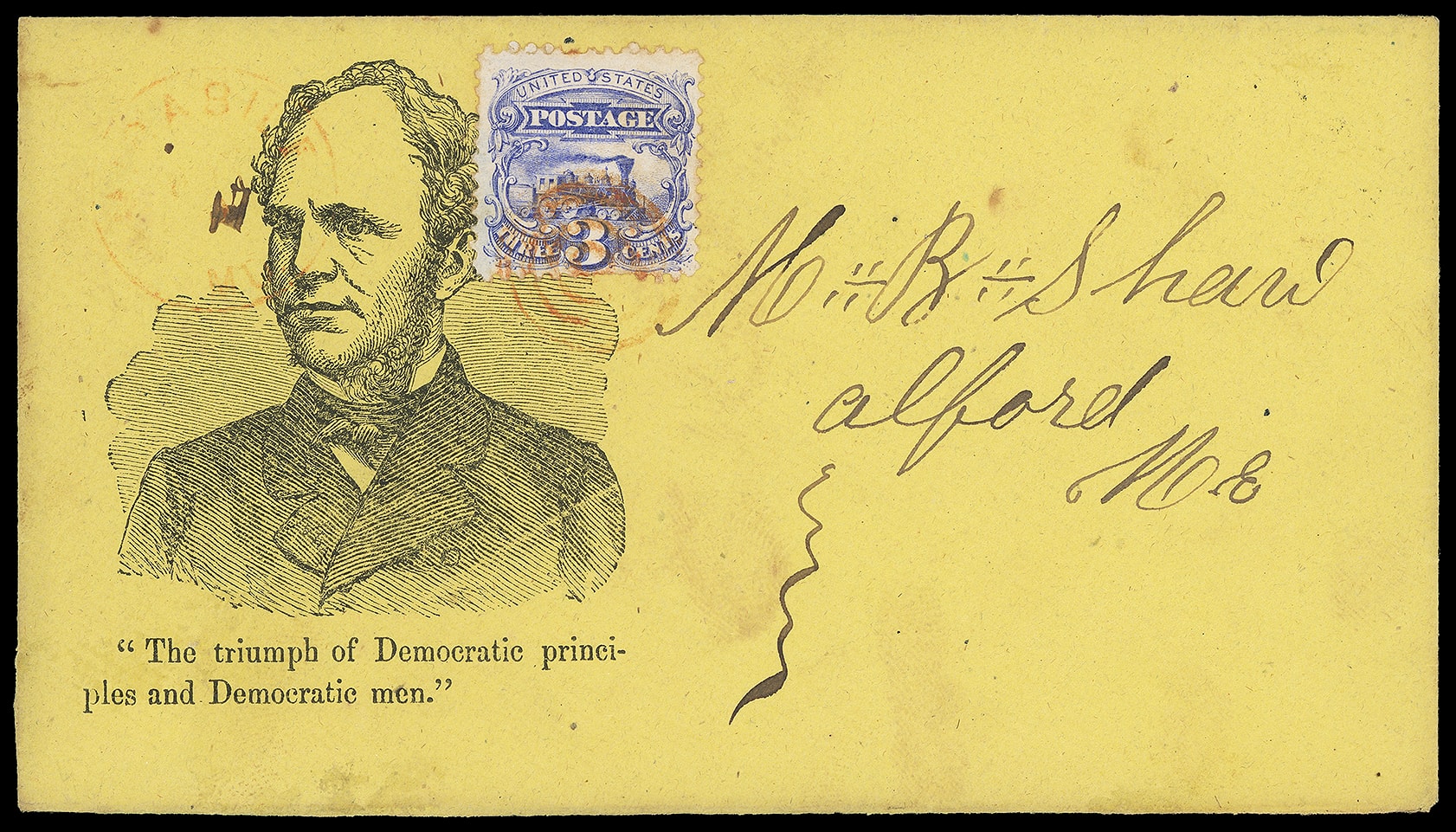 206     HS-unlisted image(1868 Campaign) Horatio Seymour. Large portrait campaign design with verse "The triump of Democratic Principles and Democratic men" below, on yellow cover bearing 3¢ ultramarine (114) tied by red target canceled, matching light "New Castle, Me." cds from H.B. Shaw correspondence to Alfred Me., Very Fine and unlisted, only recorded example.