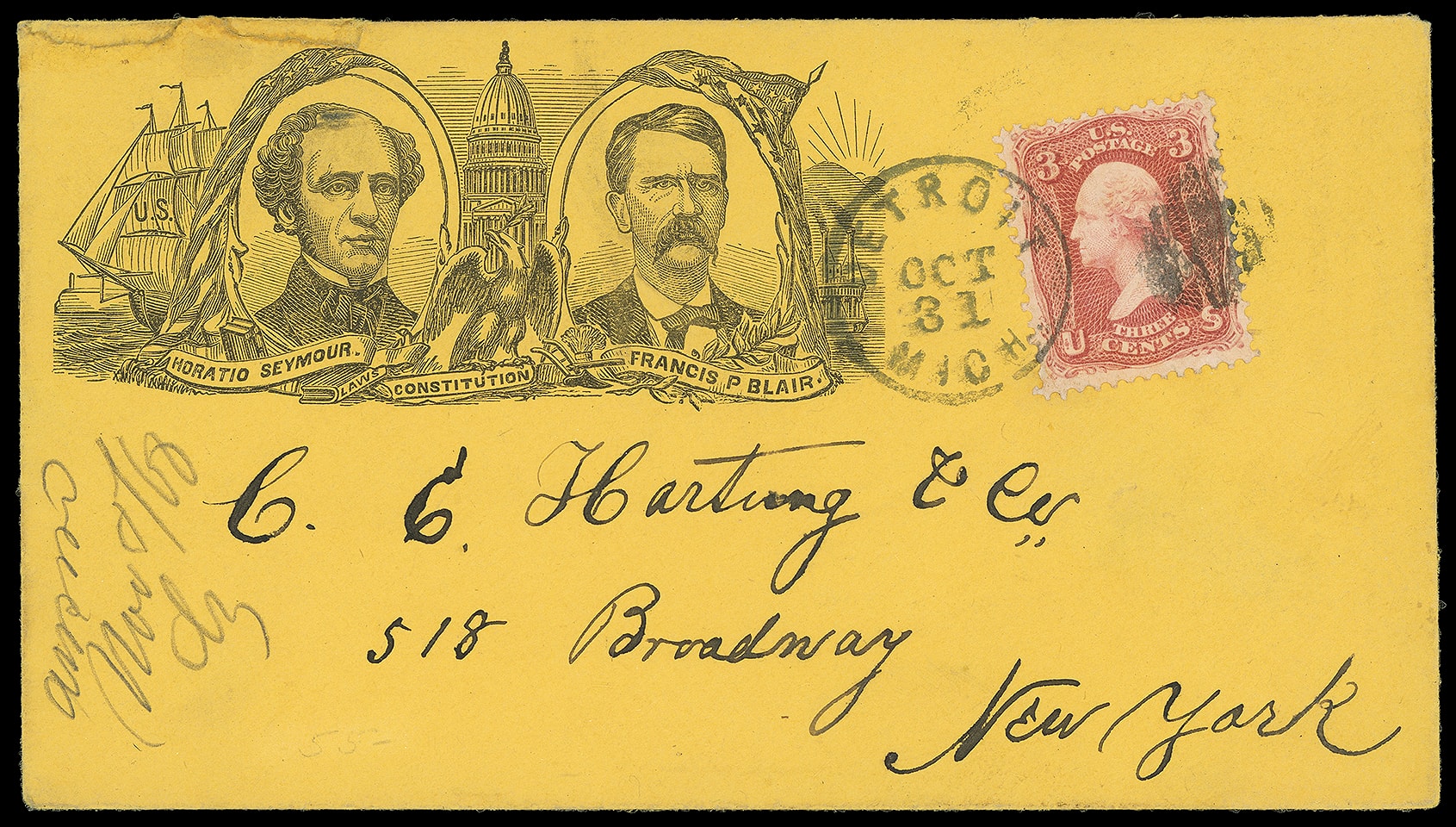 203     HS-4 image(1868 Campaign) Horatio Seymour, Francis P. Blair. Campaign design with dual oval portraits in ornate patriotic frame with "Constitution" in central ribbon on orange cover bearing 3¢ red, grill (94) tied by "Detroit, Mich. Oct 31" cds duplex with cork cancel to New York City, 1868 docketing at left; minor top left opening tear, exceptionally clean and attractive, otherwise fresh and Very Fine.