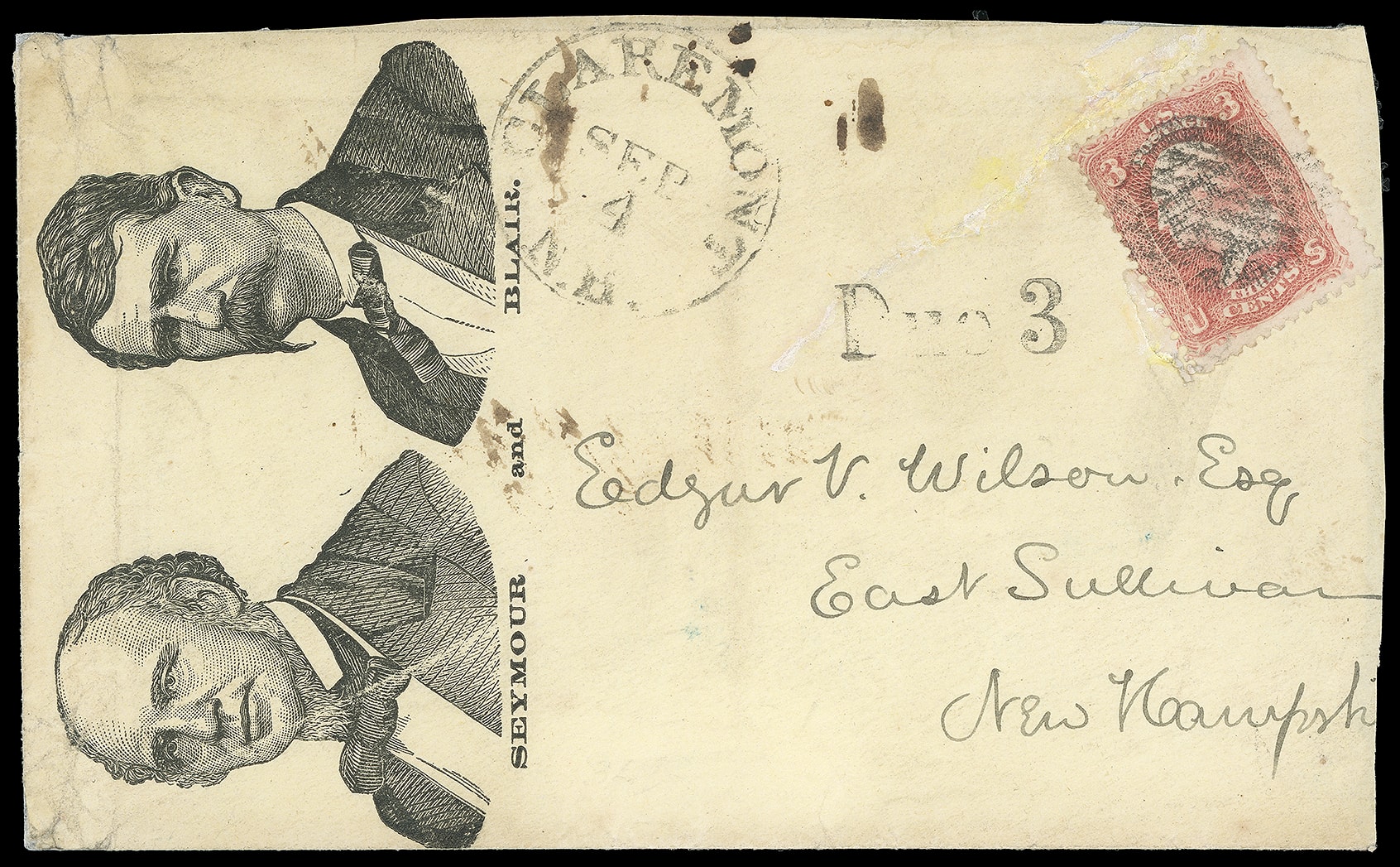 202     HS-3 image(1868 Campaign) Horatio Seymour, Francis P. Blair. Large vertical due portrait campaign design at left on amber cover bearing 3¢ red, grill (94) canceled by grid, matching "Claremont N.H. Sep 4" cds and "Due 3" handstamp to East Sullivan N.H.; reduced at top and right, expertly repaired, rare and Fine appearance.