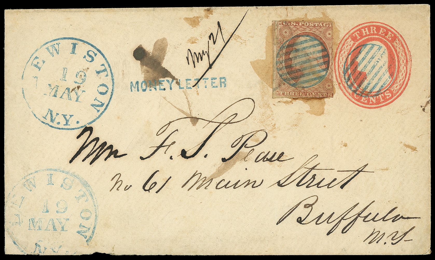332     R-LE-1 imageLewiston N.Y. "Money Letter". Blue 31.5mm straightline used with matching two strikes of "Lewiston N.Y. 19 May" cds and circular 7-bar grid cancels 3¢ yellowish rose red (11A) on 3¢ red on white entire (U9) to Buffalo N.Y., ms. "My 21" docketing, probably 1856 usage; no bottom flap, gum stains around stamp and ink smear, Fine and rare, the only recorded example, ex-Piller.