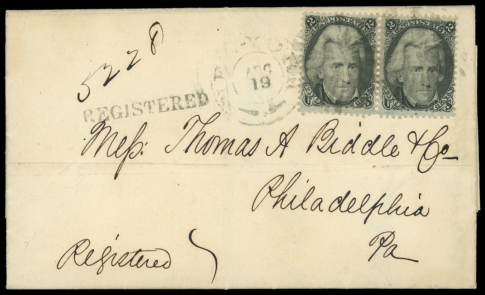 334     R-NY-3 imageNew York N.Y. "Registered". Black 35mm straightline with ms. "5228" registry number, matching "New-York, Aug 19" flueron cds and radial cancels tie 2¢ black (73) pair on 1864 folded letter to Philadelphia Pa.; right 2¢ tear, Very Fine and unique 2¢ black registered use.