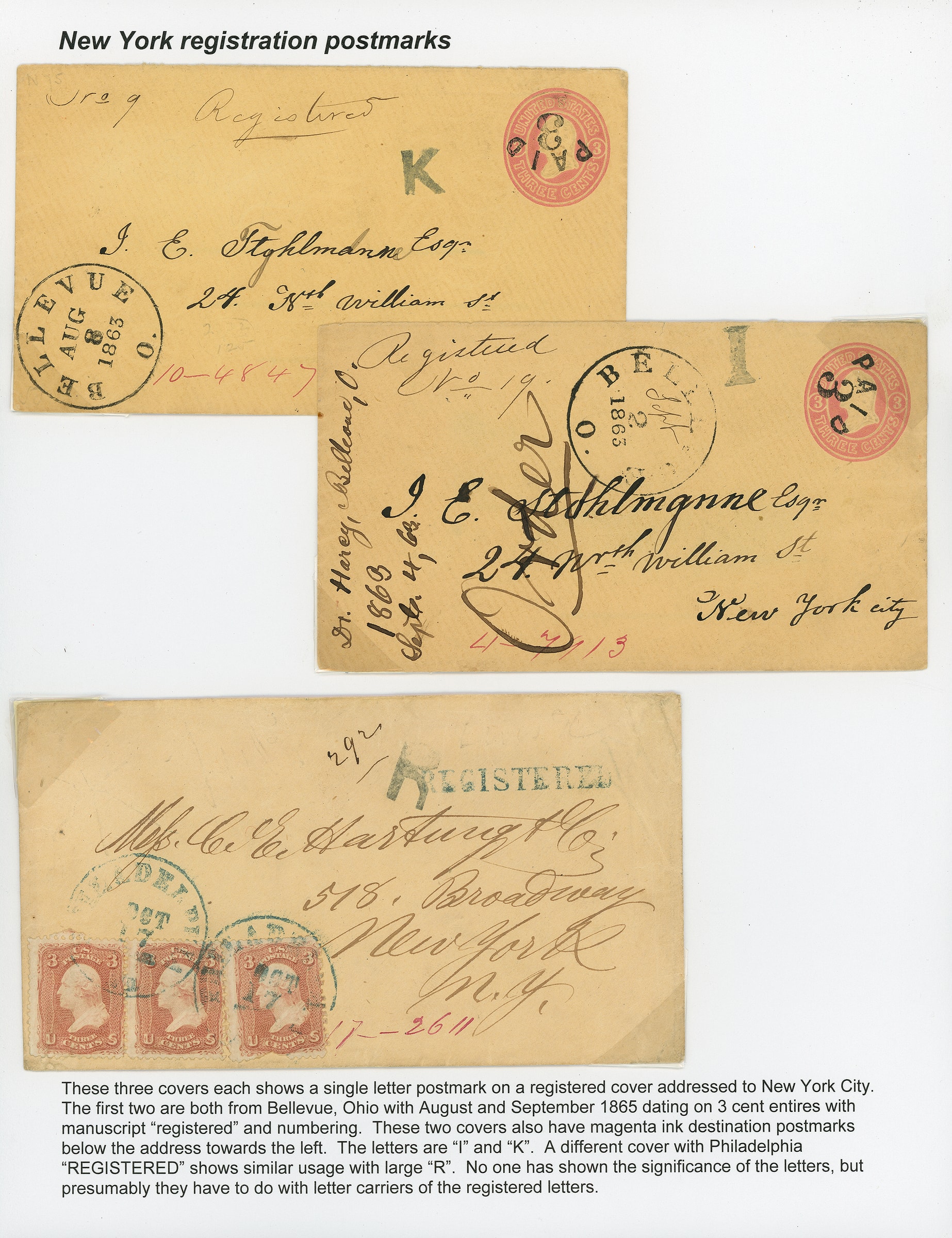 340       imageNew York N.Y. - Letter Markings. Group of three inbound covers mounted on exhibit page, each shows different letter comprising "Bellevue, O. Aug 8, 1863" cds with "Paid 3" cancel on 3¢ pink (U35) buff entire with New York "K"; "Bellevue, O. Sept 2, 1863" cds with "Paid 3" cancel on 3¢ pink (U35) buff entire with New York "I", docketed "Order" across face; and blue "Philadelphia Pa. Oct 17" cds ties 3¢ rose (65) pair and single, latter faulty, with matching "Registered" straightline and New York "R", Very Fine group.