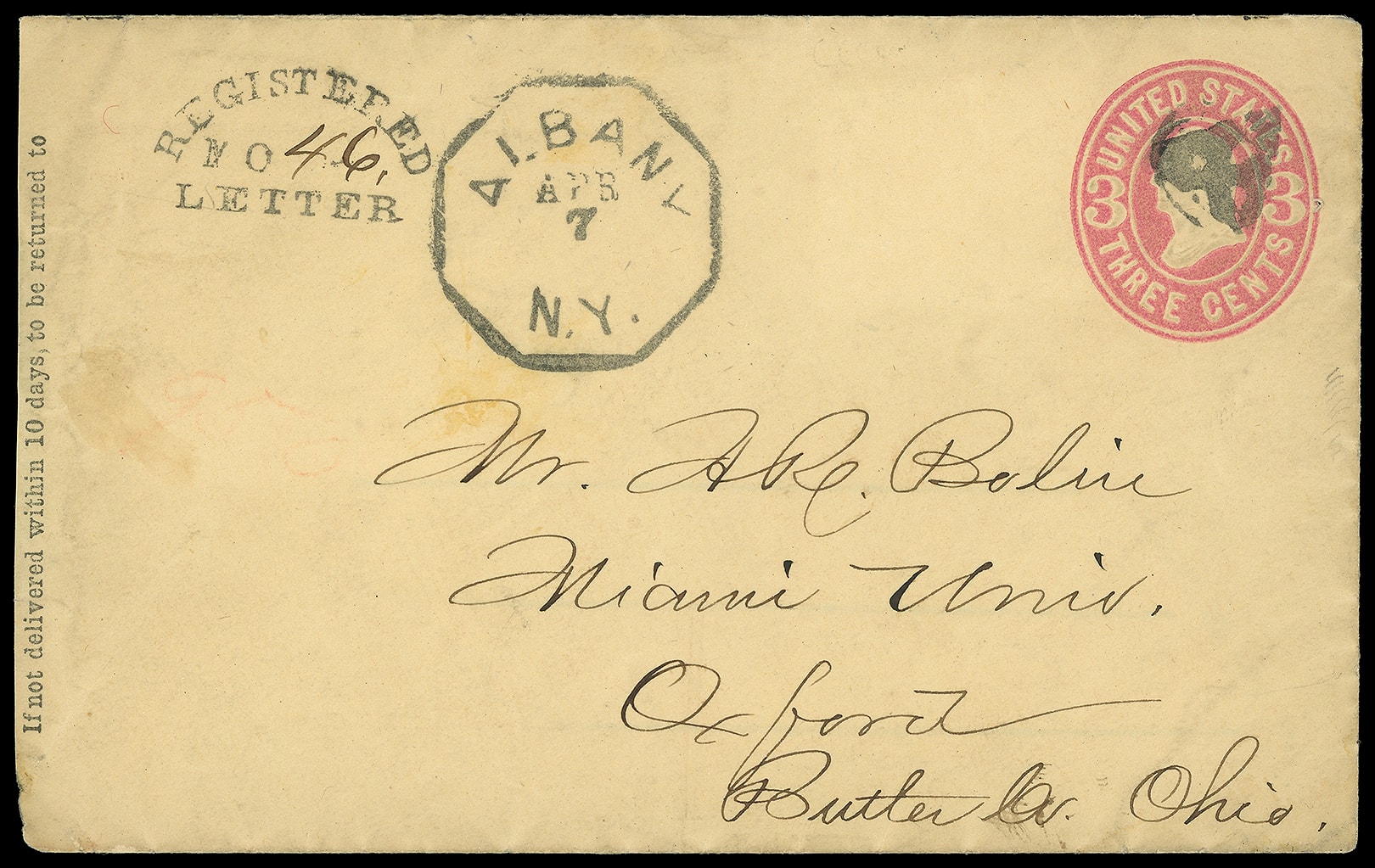 330     R-AL-1 imageAlbany N.Y. "Registered Letter No." . Black arc handstamp with ms. "46" registry number, on 3¢ pink (U59) entire canceled by fancy heart, matching "Albany N.Y. Apr 7" octagon postmark to Oxford Oh.; reduced at left, F.-V.F., a unique style of handstamp.