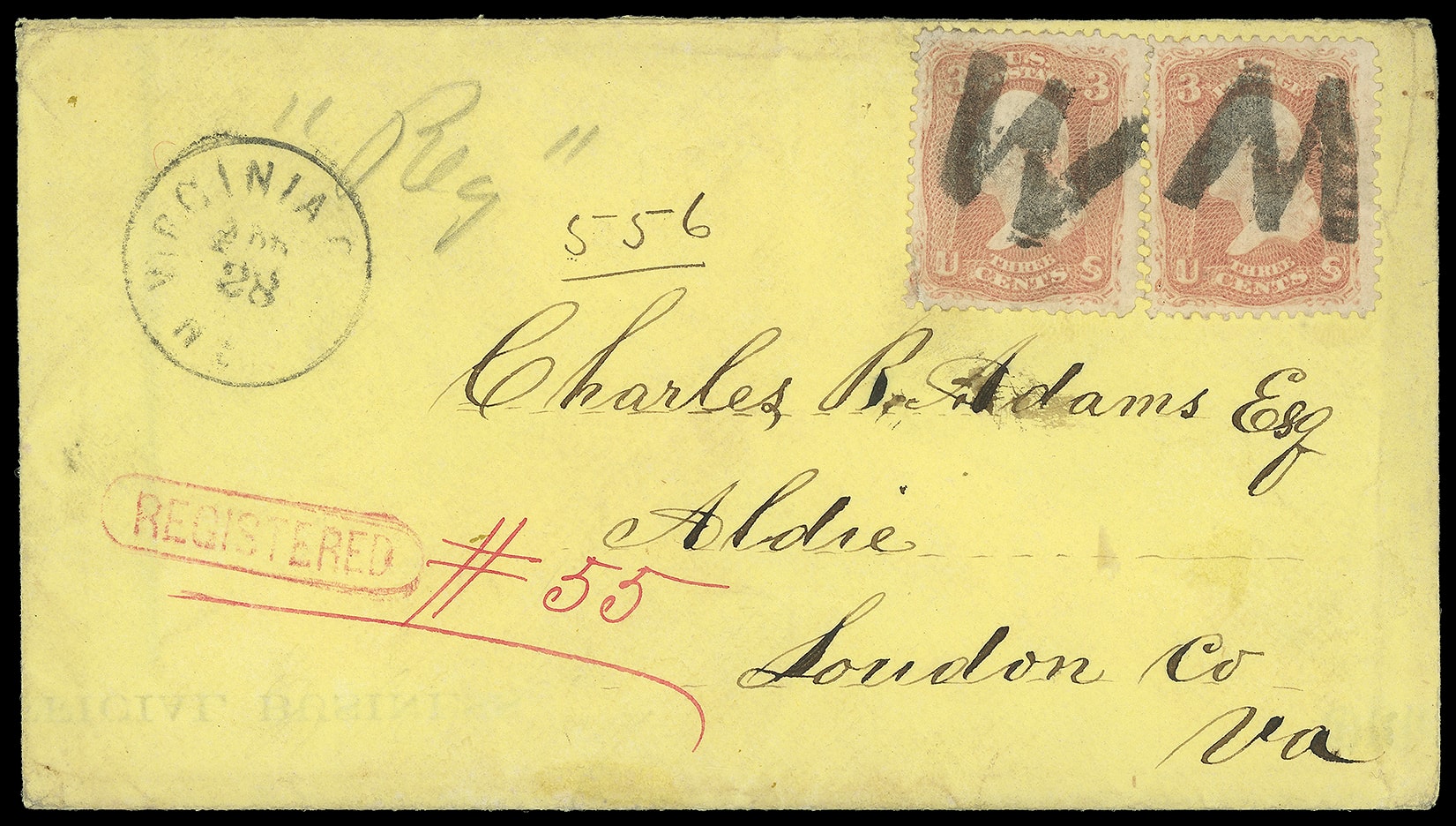 328     R-VC-1 imageVirginia City, Nevada "Registered". Red oval framed handstamp with red ms. "#55" registry number, on homemade yellow cover bearing two 3¢ rose (65) singles, each canceled by bold "W" fancy cancels, matching "Virginia City, Nev. Apr 28" cds to Aldie Va., pencil "Reg"; left 3¢ corner corner creases, Very Fine and unusual Western registered use.