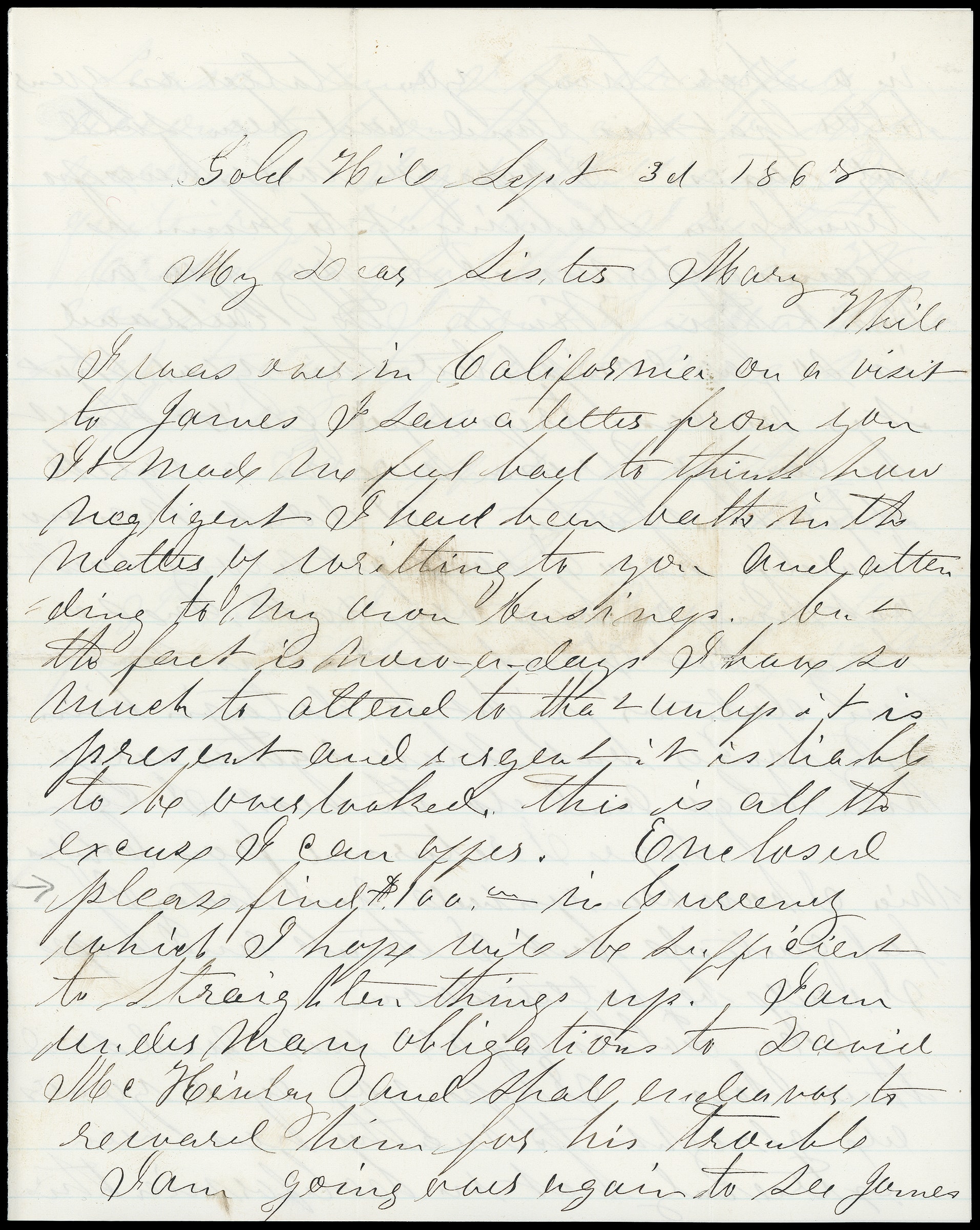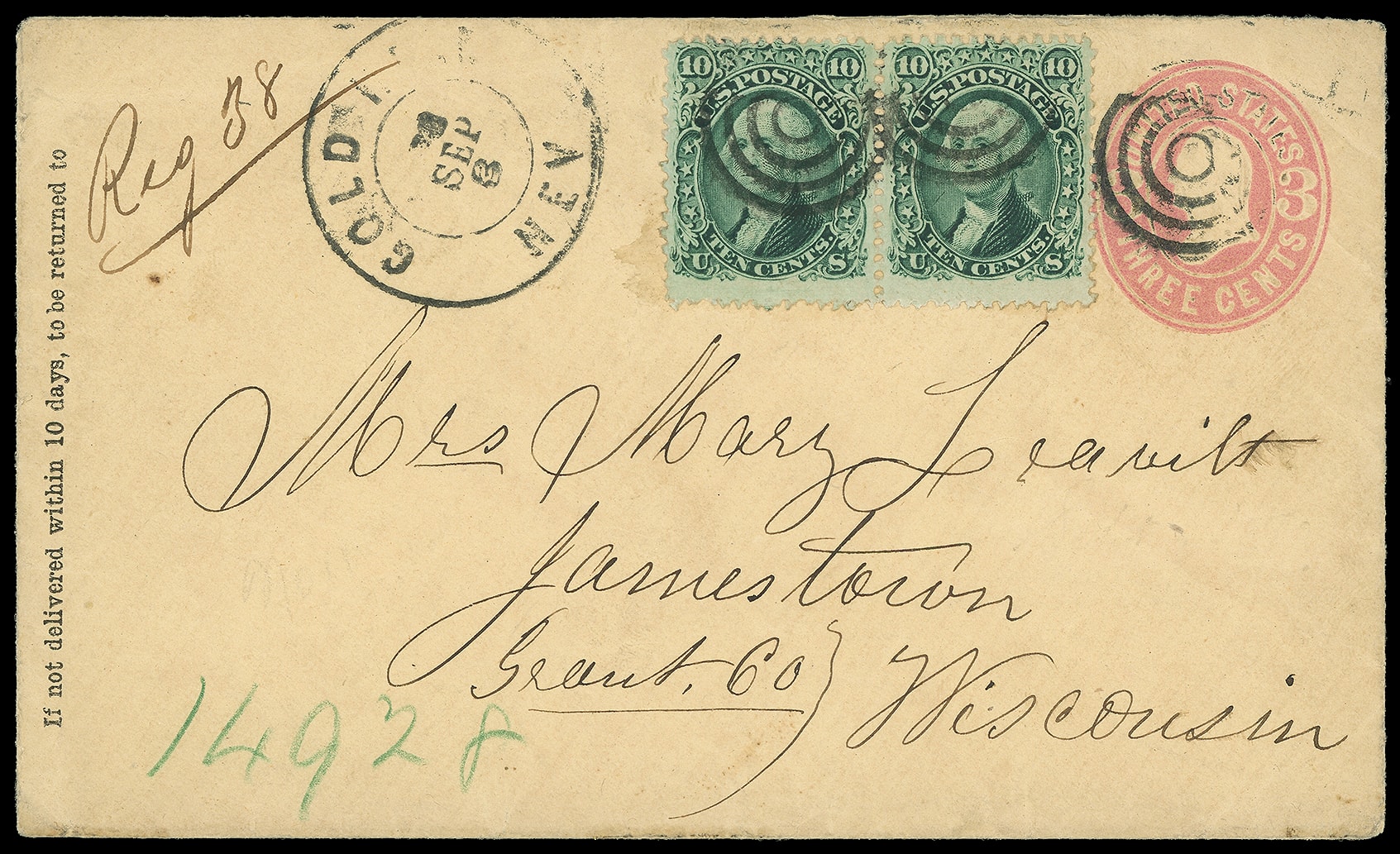 327       imageGold Hill, Nevada "Reg 38". Manuscript registry marking on 3¢ pink (U59) buff entire bearing 10¢ green (68) pair tied by four-ring cancels, matching "Gold Hill, Nev. Sep 8" cds to Jamestown, Wisc., 1868 letter; part of flap missing, Very Fine Western registered use.