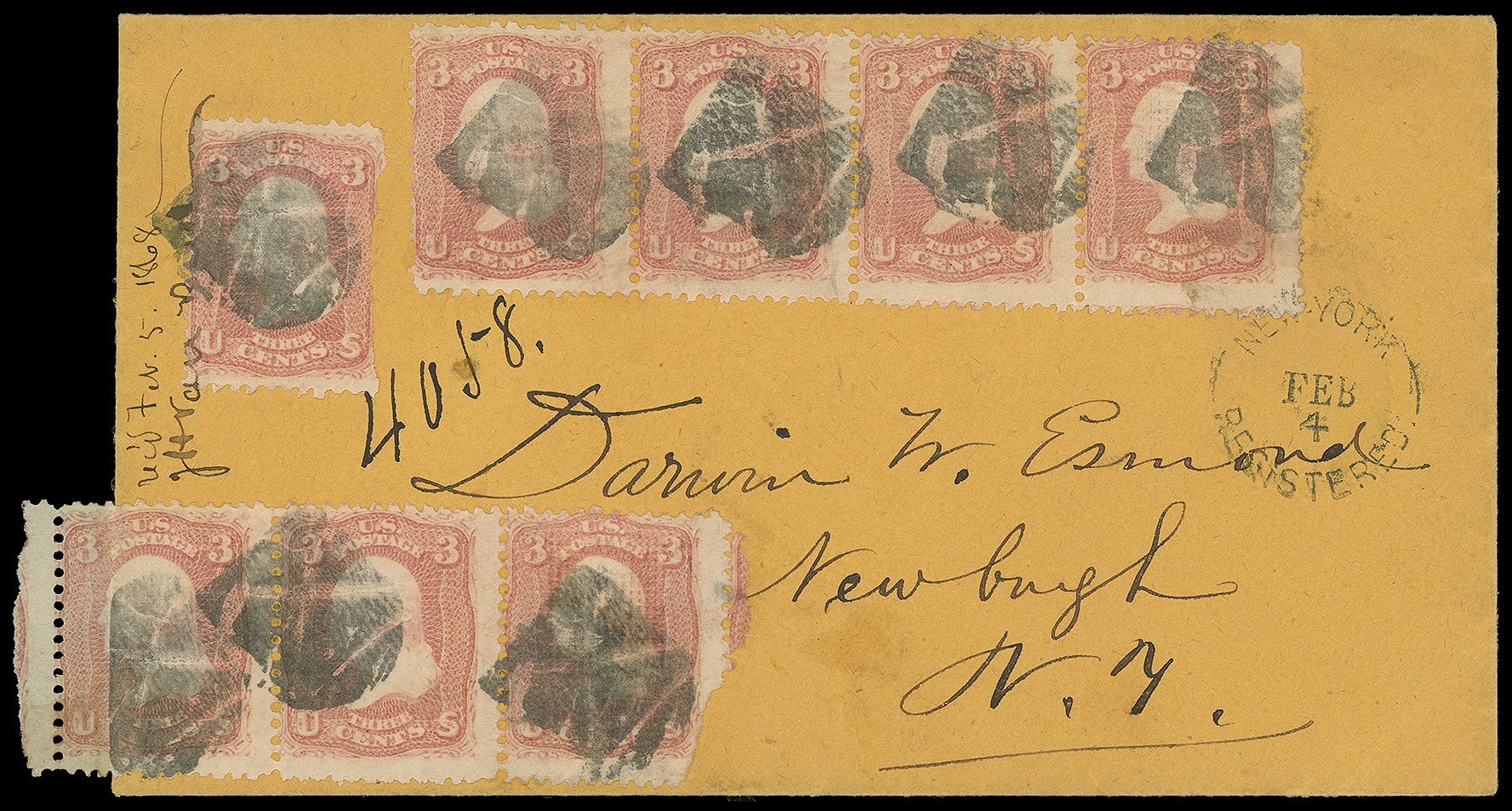 335     R-NY-9 imageNew-York, Registered, Feb 4. Rimless cds with ms. "4058" number, on orange cover bearing 3¢ rose, D grill (85) horizontal strips of three and four plus single tied by square quartered cork cancels to Newburgh N.Y.; single and right stamp of strip of three with piece out, left stamp of strip creased from fold over left edge, otherwise Very Fine and early use, with 1956 S.P.A. and 2018 Crowe certificates. Scott No. 85 $9,300.