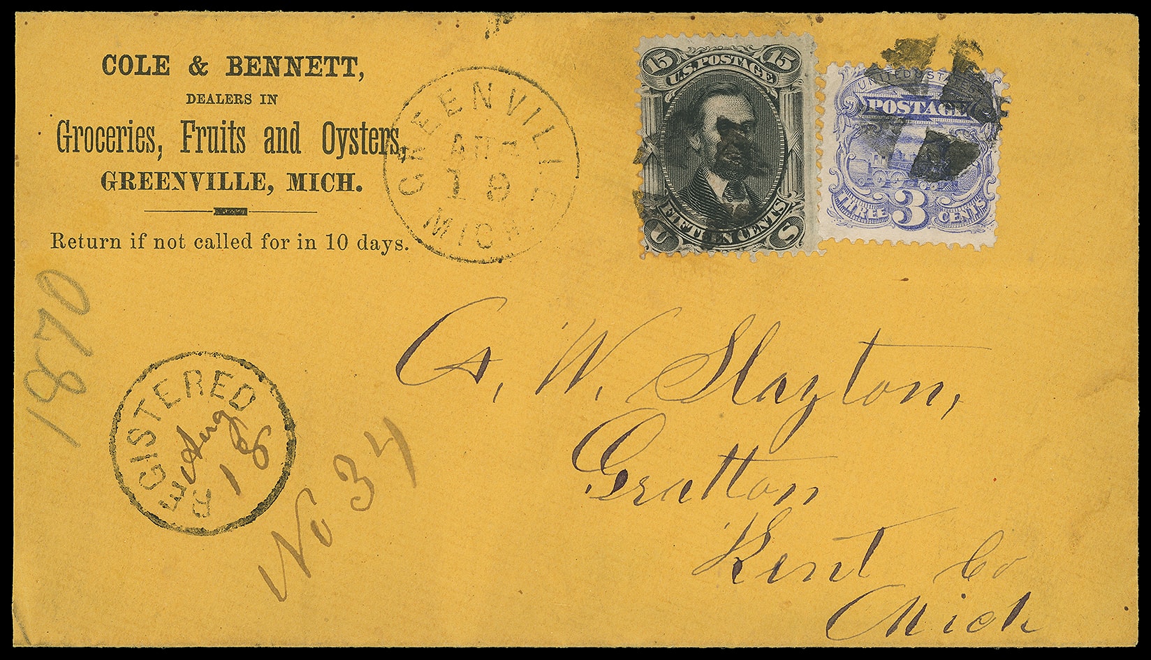 321     R-GV-1 imageGreenville Mich. "Registered". Circular handstamp with ms. "No. 34" number adjacent, matching "Greenville Mich. Aug 19" cds duplexed with quartered corks that tie combination franking of 15¢ black, F grill (98) and 3¢ ultramarine (114) on orange Cole & Bennett Groceries, Fruits & Oysters corner card cover to Gatton Mich., pencil 1870 dating, Very Fine and choice mixed issue franking, ex-Landau, with 2007 P.F. certificate.