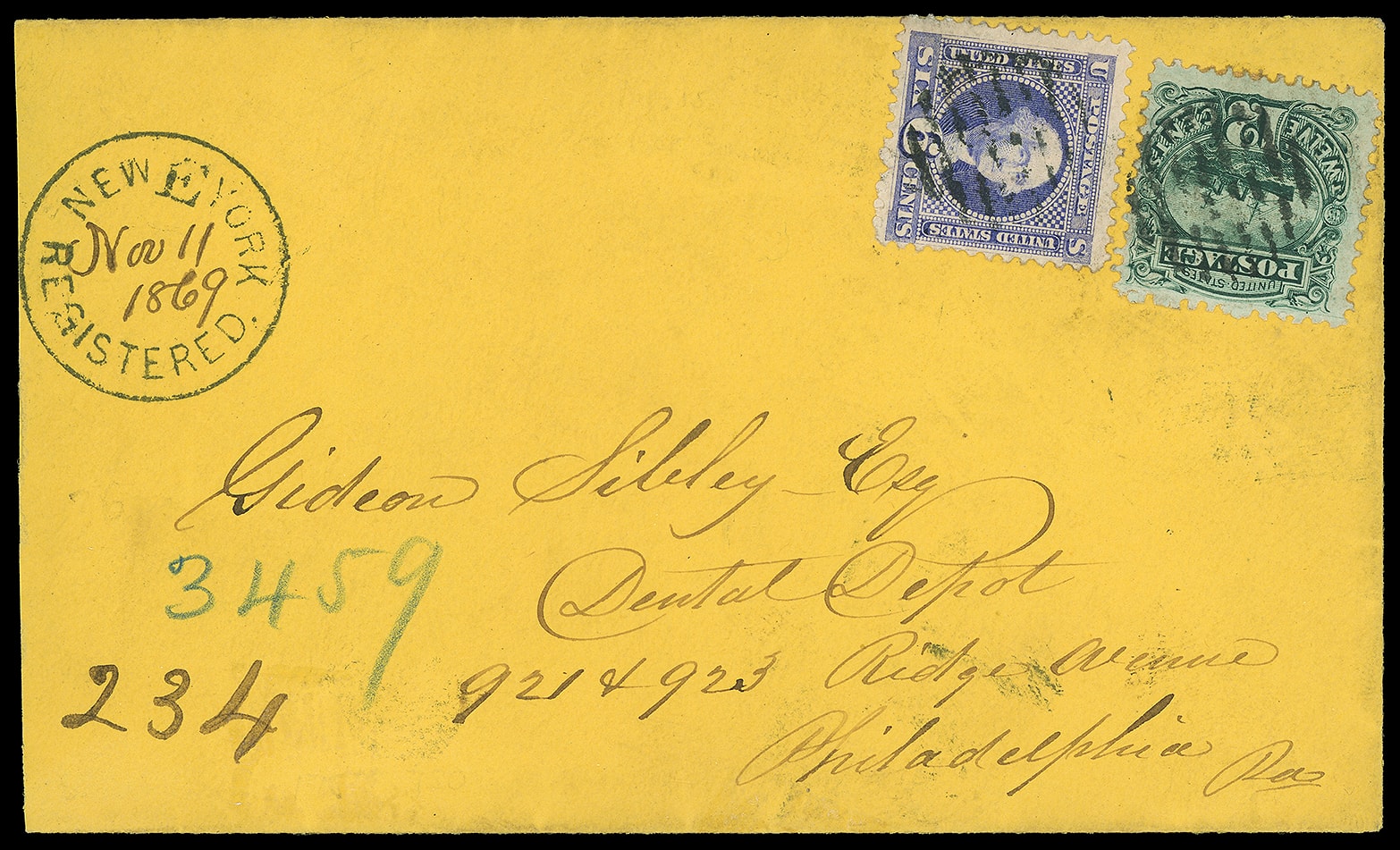 339     R-NY-12 imageNew York 'E' Registered "Nov 11, 1869". Cds with ms. dating on 1869 yellow cover bearing 6¢ ultramarine (115) and 12¢ green (117), open circular grid cancels, addressed to Dental Depot, Philadelphia Pa.; reduced at left, Very Fine and scarce 1869 Issue New York Station E registered use.