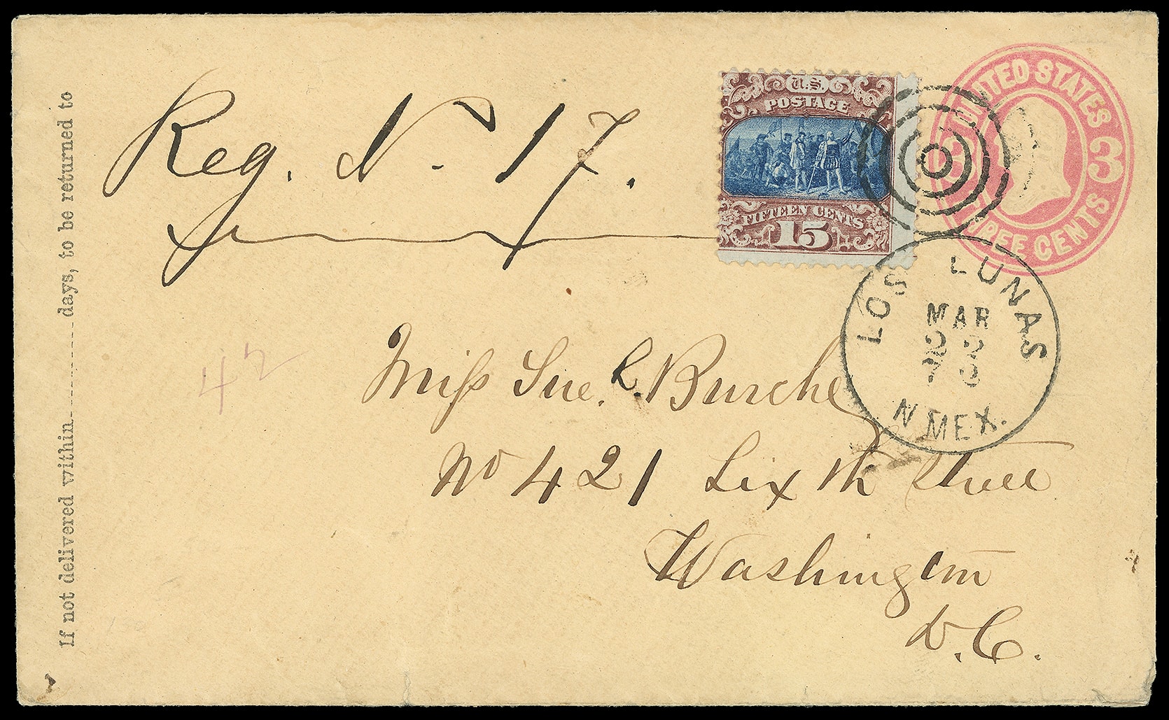 329       imageLos Lunas, New Mexico Territory "Reg. N. 17." . Manuscript marking on registered 3¢ pink (U59) entire bearing 15¢ brown & blue (119) tied by four-ring target cancel and matching choice "Los Lunas, N. Mex., Mar 22, 72" cds to Washington D.C., magenta "42" registry number; tiny bottom edge tear, reduced slightly at right, Very Fine and choice, ex-Haas, Lafayette (Walske), Kramer.