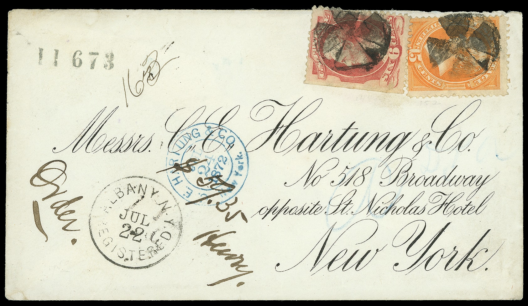 331       imageAlbany N.Y., Registered, Jul 22. Cds with matching 11673" registry number on registered cover bearing 6¢ carmine (148) nat. s.e. and 15¢ bright orange (152) tied by Maltese cross fancy cancels with fancy script preprinted address to C.E. Hartung & Co., New York N.Y., blue Hartung arrival d.s. with ms. "$59.35" money docketing, original letter accompanies; 6¢ affected slightly from edge placement, Very Fine and attractive registry use.
