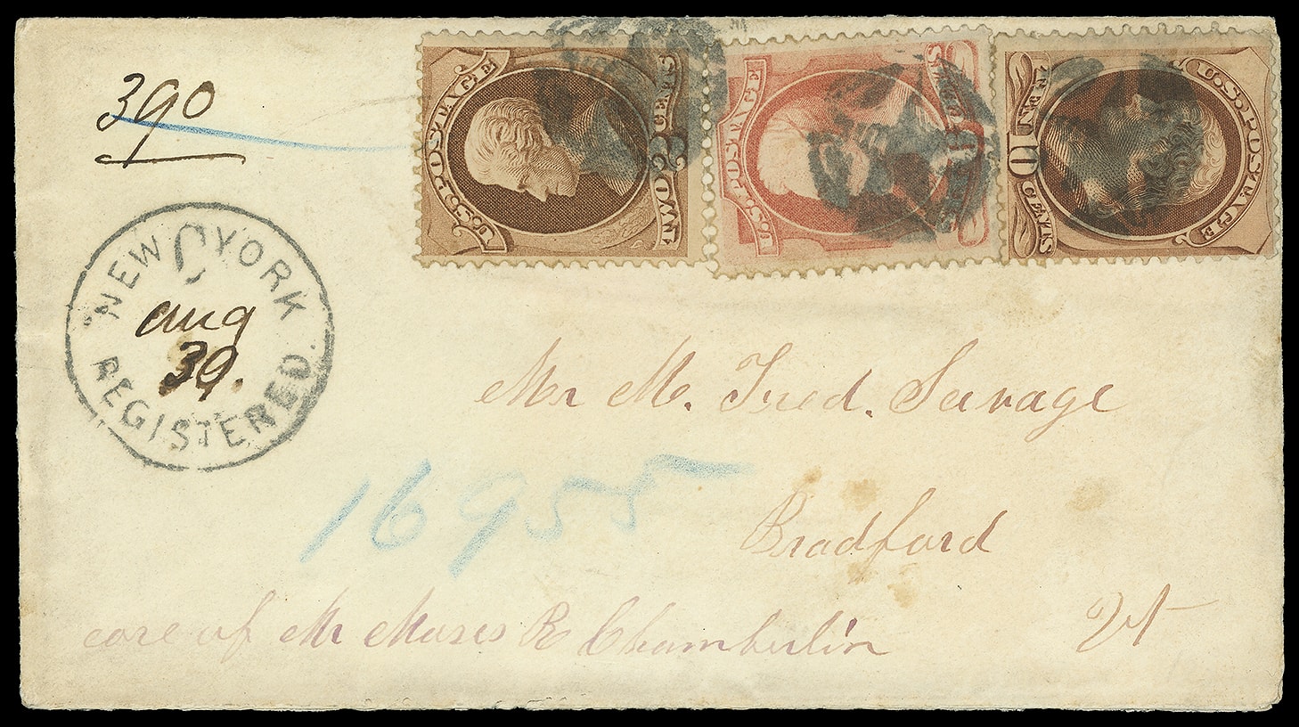338       imageNew York 'C' Registered, "Aug 30". Station cds with ms. date and matching ms. "390" registry number crossed out in blue crayon with "16955" number added, matching star fancy cancels tie 2¢ red brown (146), 6¢ dull pink (159) and 10¢ brown (150) on cover to Bradford Vt.; flap with registry receipt remnant, Very Fine and rare NYC station registry use.