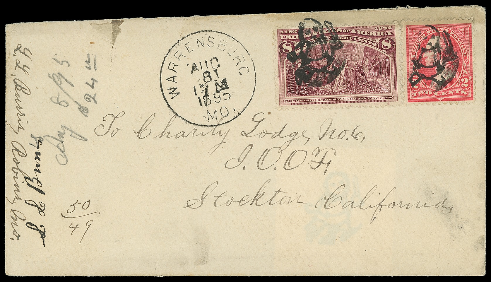 326       imageWarrensburg Mo Aug 8, 1895. Cds duplexed with "Child Holding Sword" fancy cancels tie 8¢ Columbian (236) and 2¢ rose pink (279Bc) on cover to Stockton Cal., docketed as "$24.00" enclosed at left; some extra ms., Very Fine and scarce early pictorial registry fancy cancels.