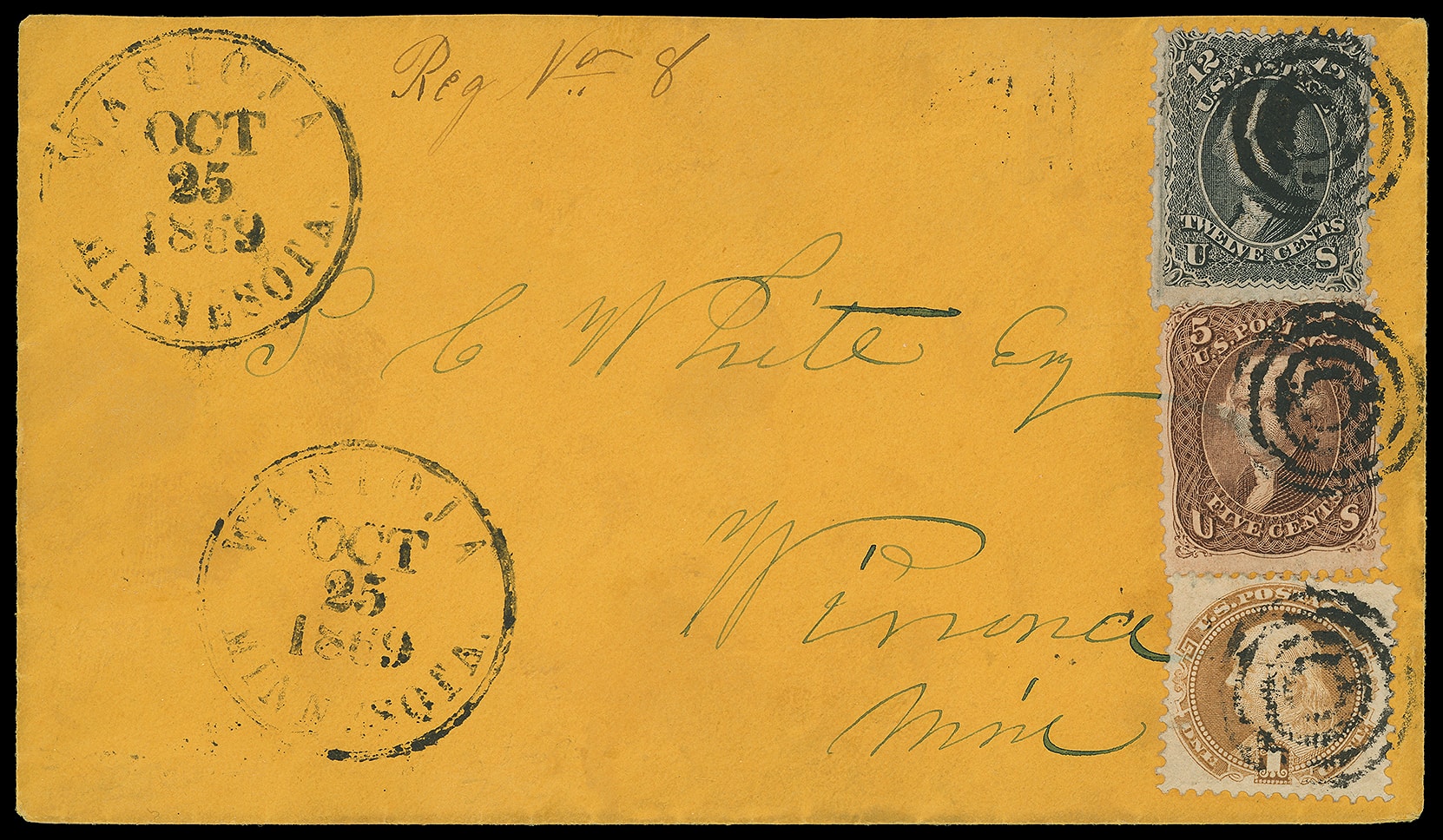 323       imageWasioja, Minn. Orange cover bearing combination franking of 1868, 5¢ brown, F. grill (95), rounded corner, 12¢ black, F. grill (97) and 1869, 1¢ buff (112), each canceled by bold four-ring cancel, matching two strikes of "Wasioja, Minnesota, Oct 25, 1869" cds and ms. "Reg. No. 8" at top to Winona Minn., Very Fine and rare 1868-1869 registered combination.