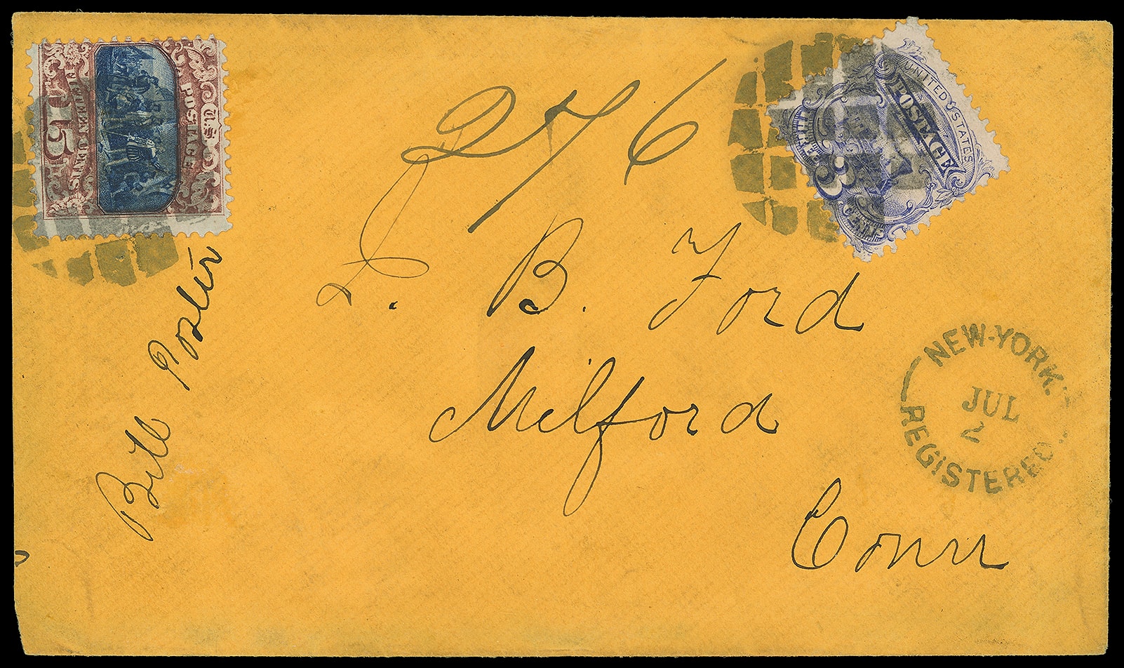 336     R-NY-9 imageNew York N.Y. "New York. Registered, Jul 2". Rimless cds with matching large circular grid cancels tie 3¢ ultramarine (114) and 15¢ brown & blue (119), rich colors, perfs in, on 1869 orange cover to Milford Conn.; reduced slightly at left, 3¢ corner tear, Very Fine, ex-Kuphal.