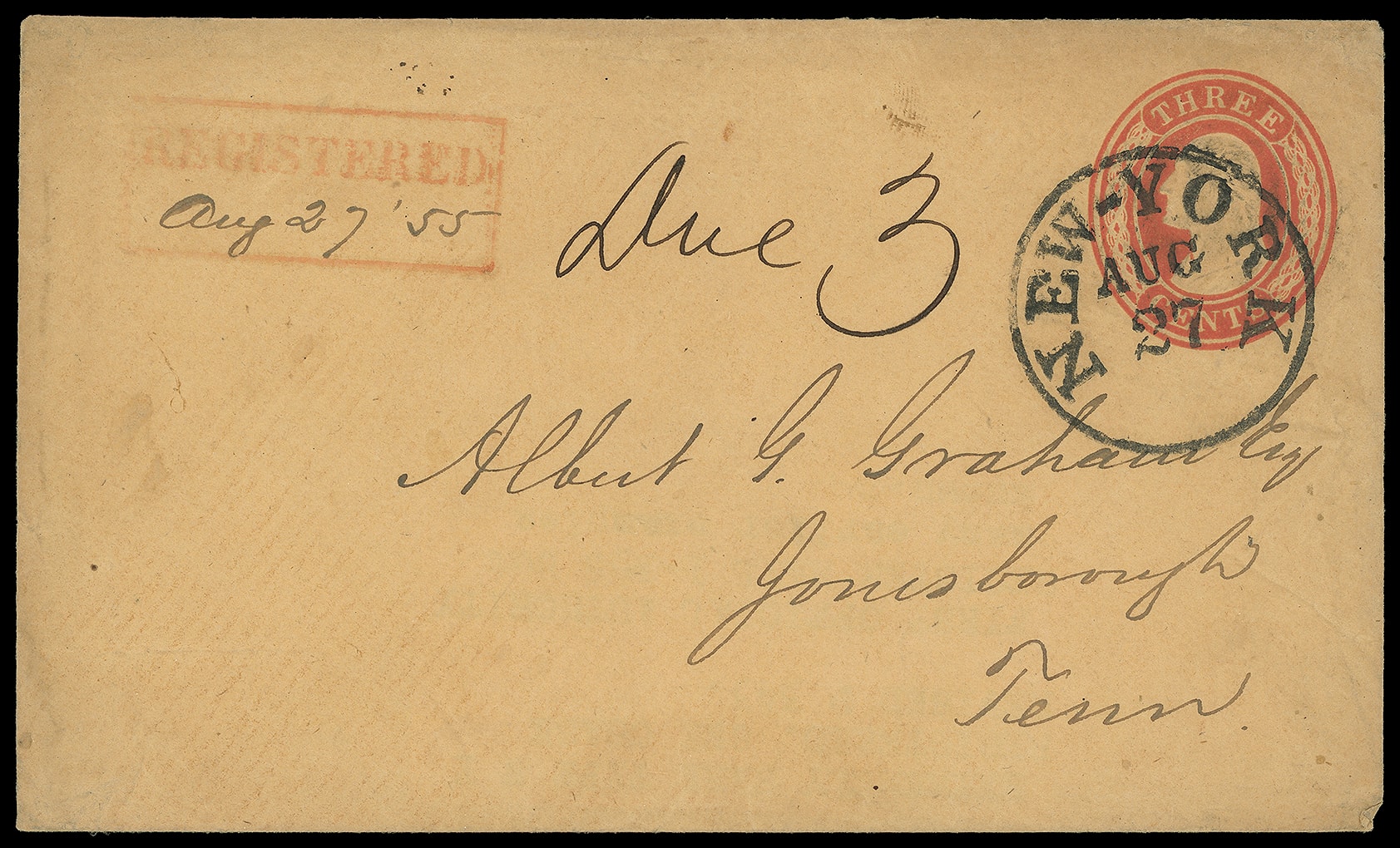 333     R-NY-1 imageNew York N.Y. "Registered". Framed handstamp with ms. "Aug 27 '55" dating on 3¢ red (U10) buff Nesbitt entire canceled with bold "New-York, Aug 27" cds to Jonesborough Tenn., ms. "Due 3" rating, Very Fine, only 2-3 examples recorded.