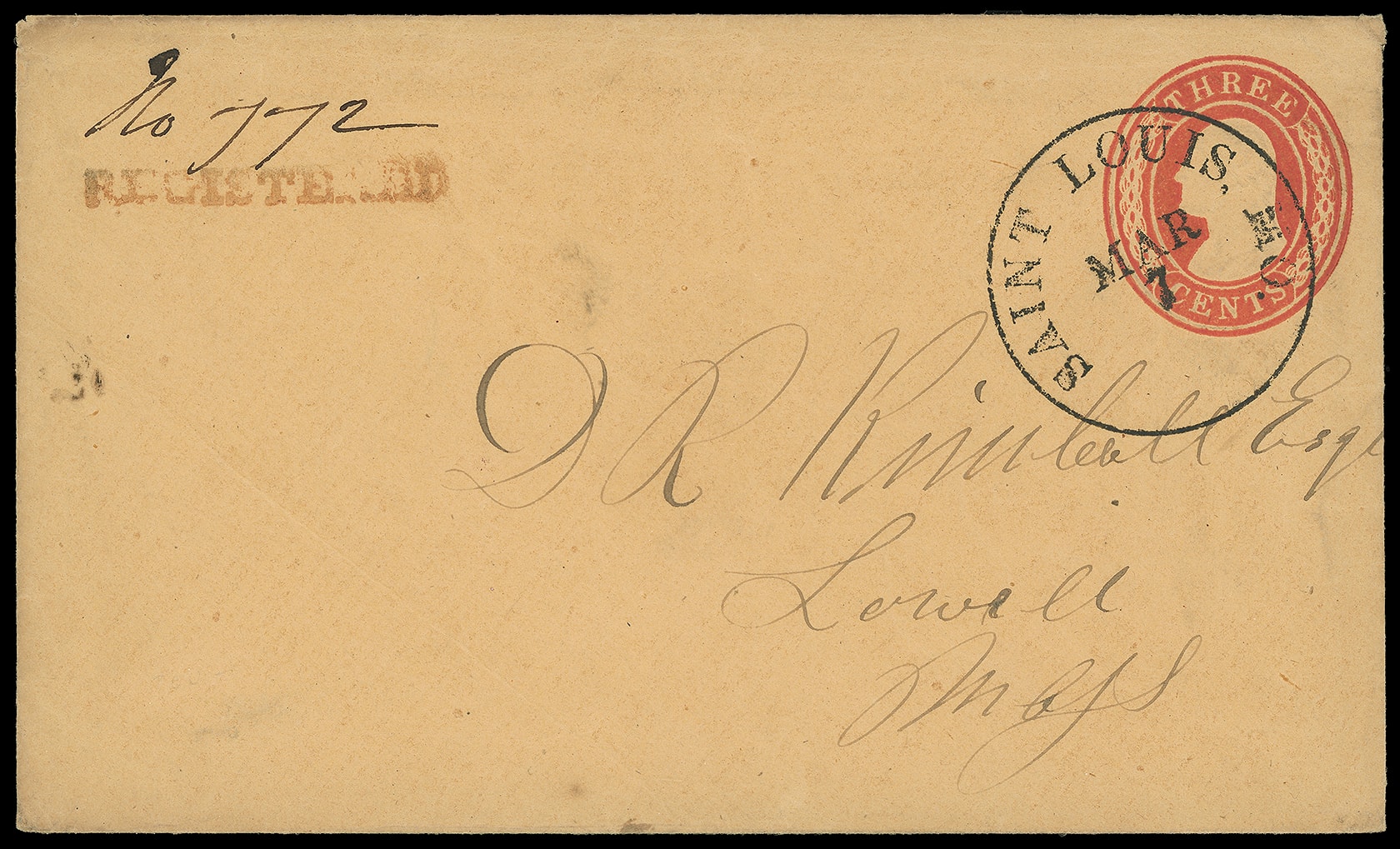 325     R-ST-1 imageSt. Louis, Mo. "Registered". Red straightline with ms. "No 772" number on 3¢ red (U10) buff Nesbitt entire canceled by sharp "Saint Louis, Mo. Mar 7" cds to Lowell Mass., Very Fine.