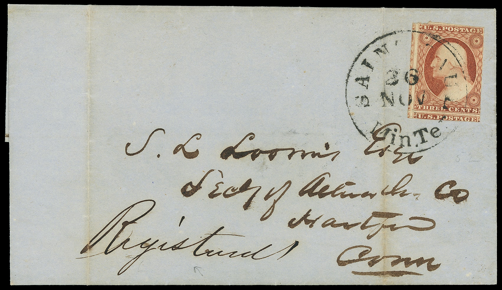 322       imageSaint Paul, Min. Ter. "Registered". Manuscript postmark on blue folded 1852 letter bearing 3¢ dull red (11A), huge margins to in, tied by "Saint Paul, Min. Ter. 26 Nov" cds to Hartford Conn.; file folds, Very Fine, the only recorded unofficial registered territorial cover.