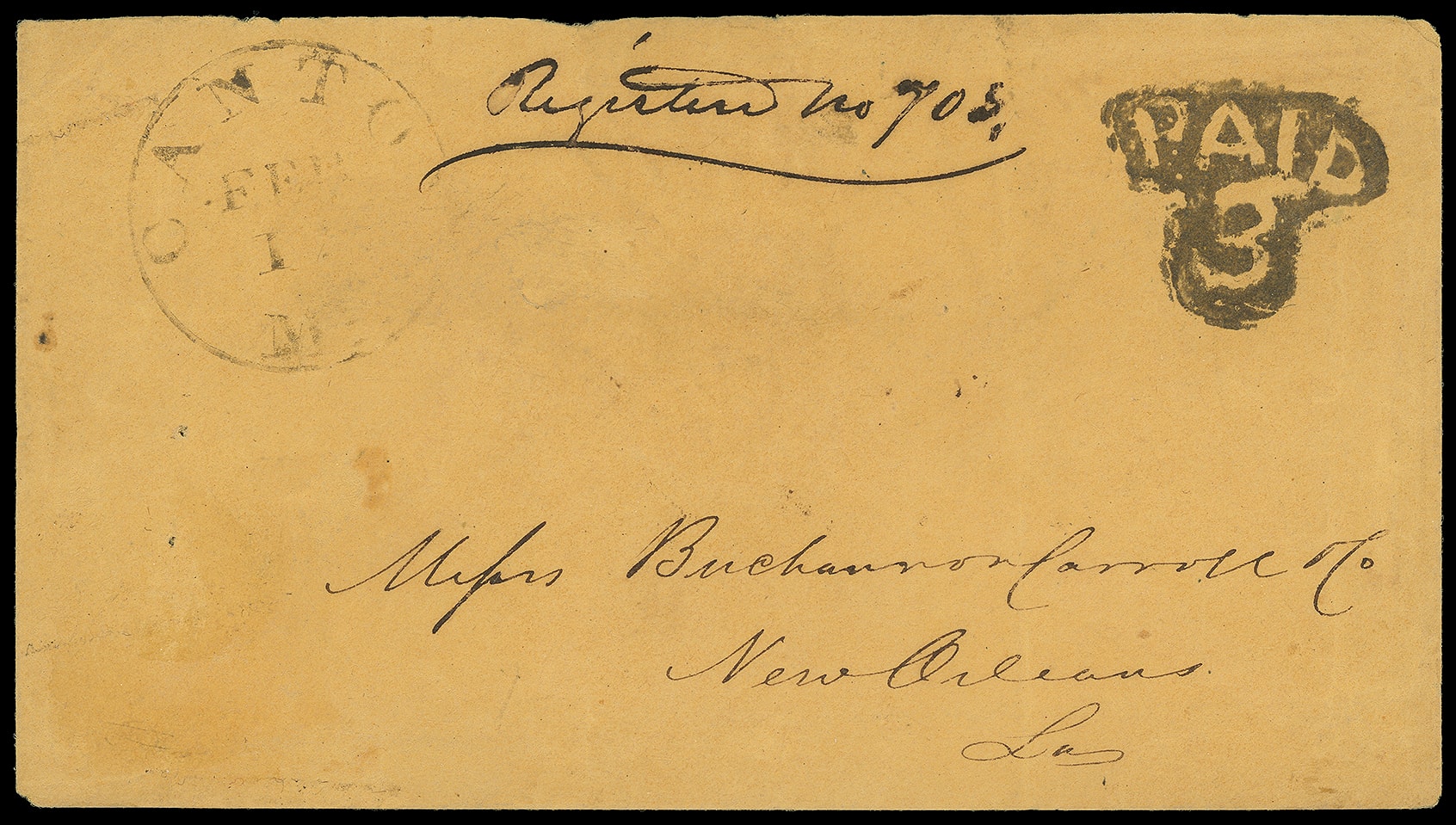 324       imageCanton Miss. "Registered No. 705." . Manuscript marking with light "Canton Ms. Feb 1" cds and bold negative "Paid 3" rating on buff cover from the Buchannon Carroll & Co. to New Orleans La.; some small flaws, Very Fine and rare fancy registered use.
