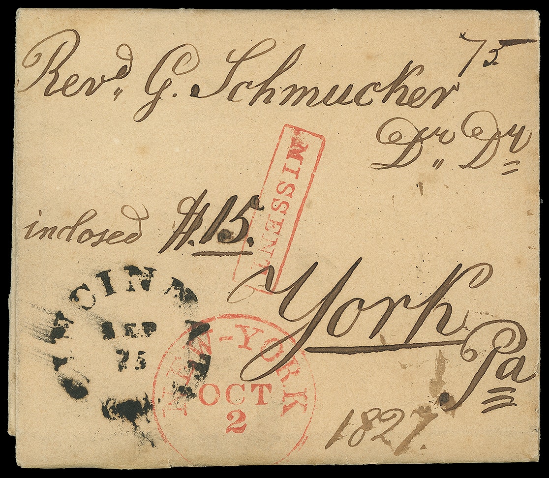 343       imageCincinnati O. Sep 25. Rimless cds with ms. "75" cent triple-weight rating to York Pa., endorsed "inclosed $15.", red "New-York, Oct 2" cds and matching "Missent" framed handstamp, Very Fine and extremely early money letter.