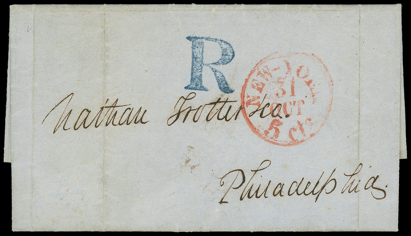 357     R-PH-1 imagePhiladelphia Pa. Large Blue "R". Perfect strike of bold blue registry handstamp on 1845 blue folded letter with red "New-York '5 cts' 31 Oct" integral-rate cds for under 300 miles to Philadelphia Pa.; file folds, Very Fine and choice, ex-Berkun (Aristocrats), with 2004 P.F. certificate.