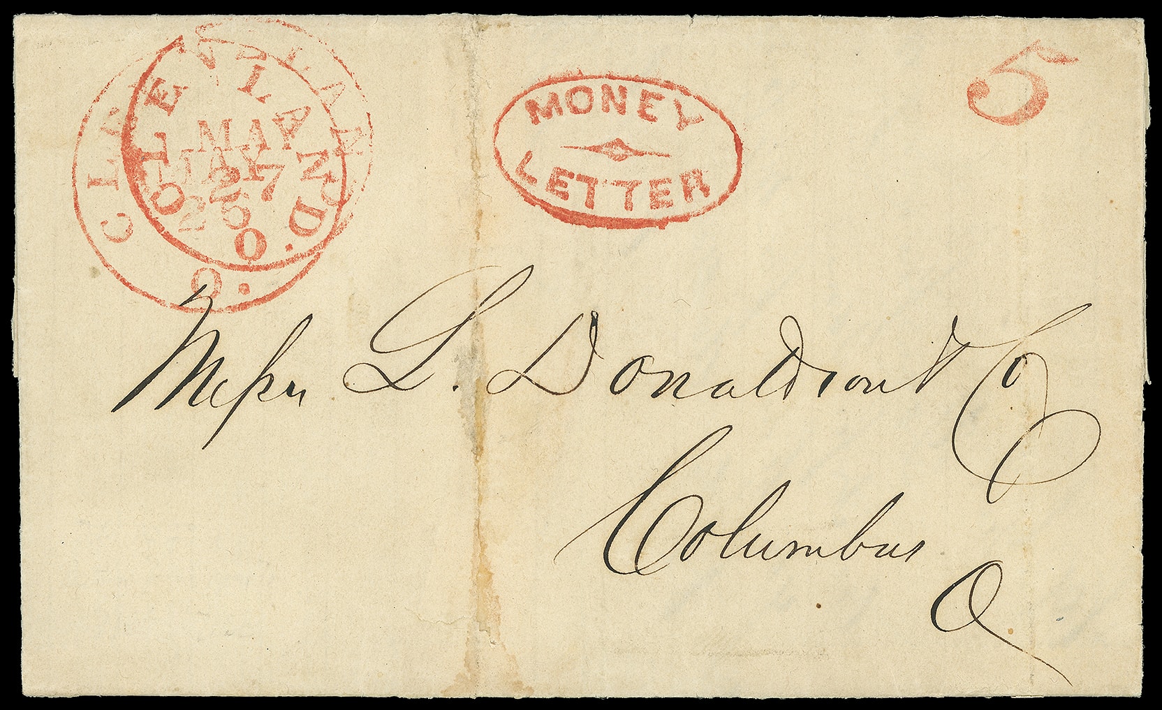 346     R-CL-1 imageCleveland, Ohio "Money Letter". Choice red oval handstamp with matching double strike of "Cleveland O. May 27" cds and "5" rating handstamp on 1851 folded letter to Columbus, Ohio; some reinforcing with light vertical fold stain and small tear, a Very Fine strike, ex-Landau.