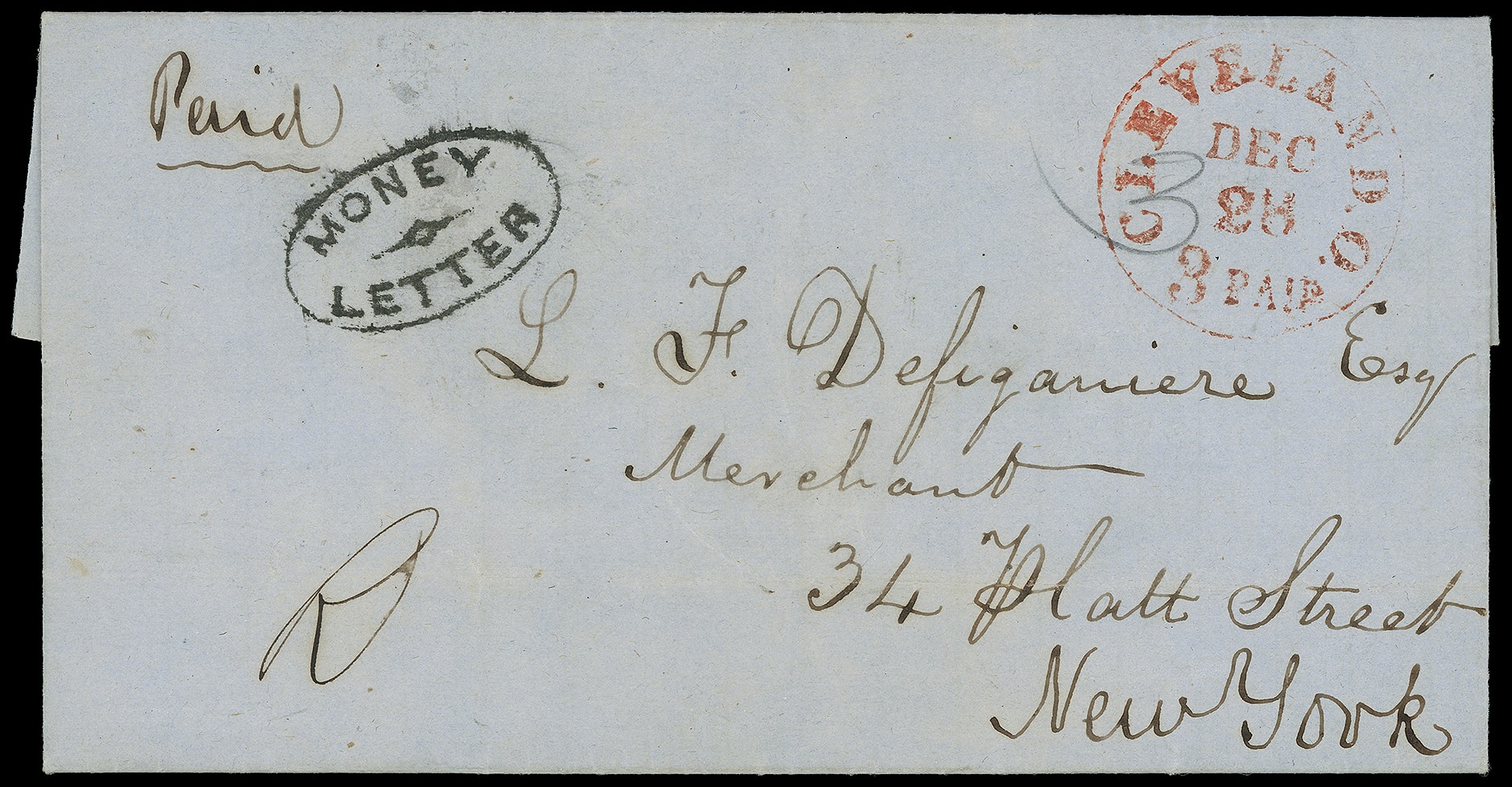 347     R-CL-2 imageCleveland, Ohio "Money Letter". Bold black oval handstamp on 1852 blue folded letter with red "Cleveland. O. '3 Paid' Dec 28" integral-rate cds to New York City, additional ms. "R" registry marking at bottom left; some light wrinkles, Very Fine.