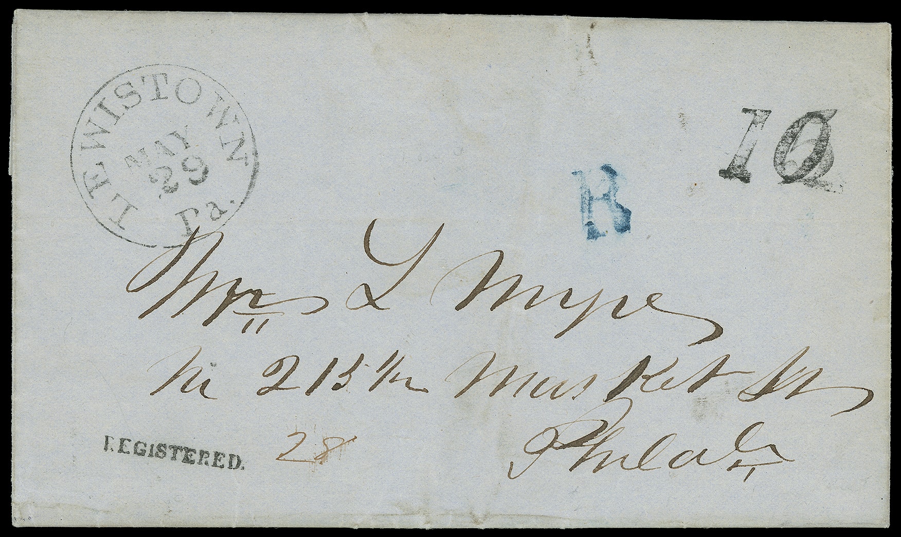 352     R-LW-1 imageLewiston Pa. "Registered". Small 23mm straightline, matching "Lewistown Pa. May 29" cds and "5" overstruck with "10" rating handstamp on blue 1850 folded letter to Philadelphia Pa., upon receipt small blue "R" registered handstamp struck with ms. "28" at lower right, Very Fine and rare early registered marking, ex-Chase.